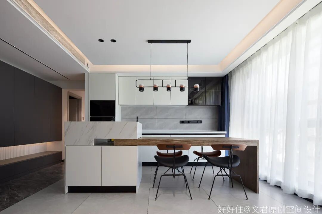 文君原创空间设计:西厨在开放区域,以整洁的黑白橱柜占据了一面墙。中间岛台和餐桌一体化设计,大理石与原木搭配,个性简约。