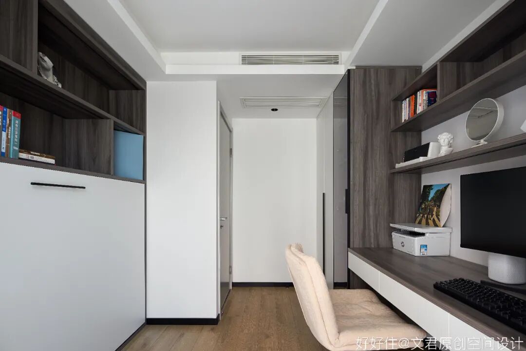 文君原创空间设计:从门口方向看,整体定制的柜体,下面是壁挂床,上面是展示柜;设计了业主喜欢的长条书桌,1.8米的长度,可供两人办公使用。