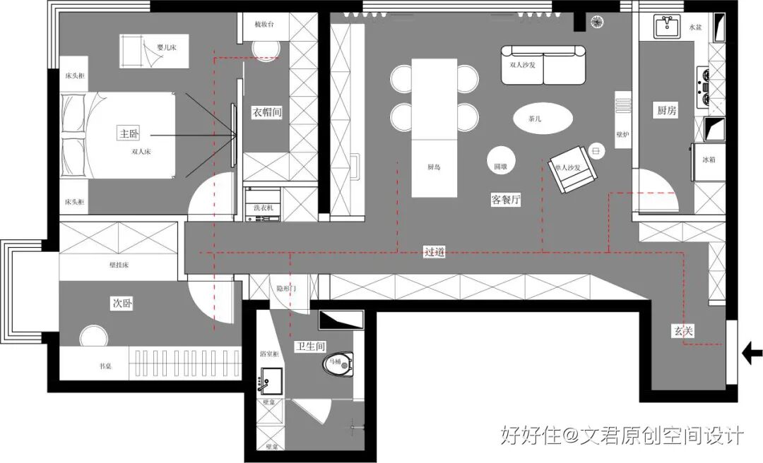 文君原创空间设计:动线图。整个设计客餐厅是亮点,以轴线分割,开放式布局。看完整屋后可以感受到整个空间的材料多元化,以金属,木制,玻璃,水泥为媒介,在保持风格统一的同时,又将空间层次感巧妙渲染。在看不到的地方,全屋还运用到了智能家居——灯光、窗帘...带来更为高级的居住体验。