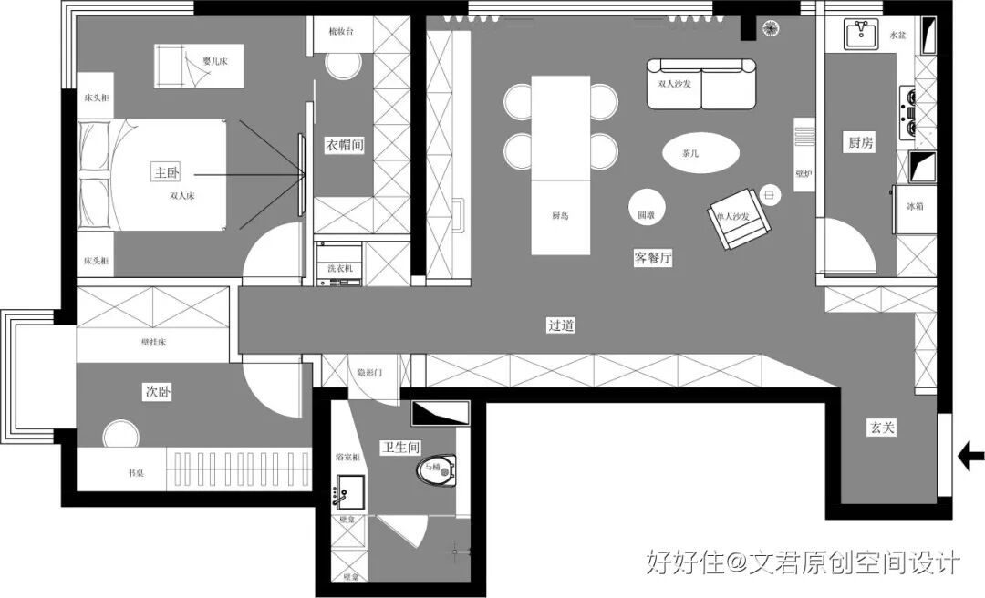 文君原创空间设计:从窗户方向看,自然光下,整齐一体的灰色定制柜让空间更加整洁、高级。