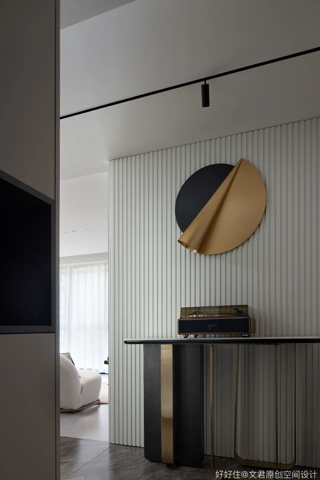 文君原创空间设计:个性的挂件,让我们一进门就感受到了一股现代时尚的质感。对门定制柜放鞋子、包包很方便;拐角这个墙边桌既是配合风格的搭配,也是一些零碎摆件的放置处。