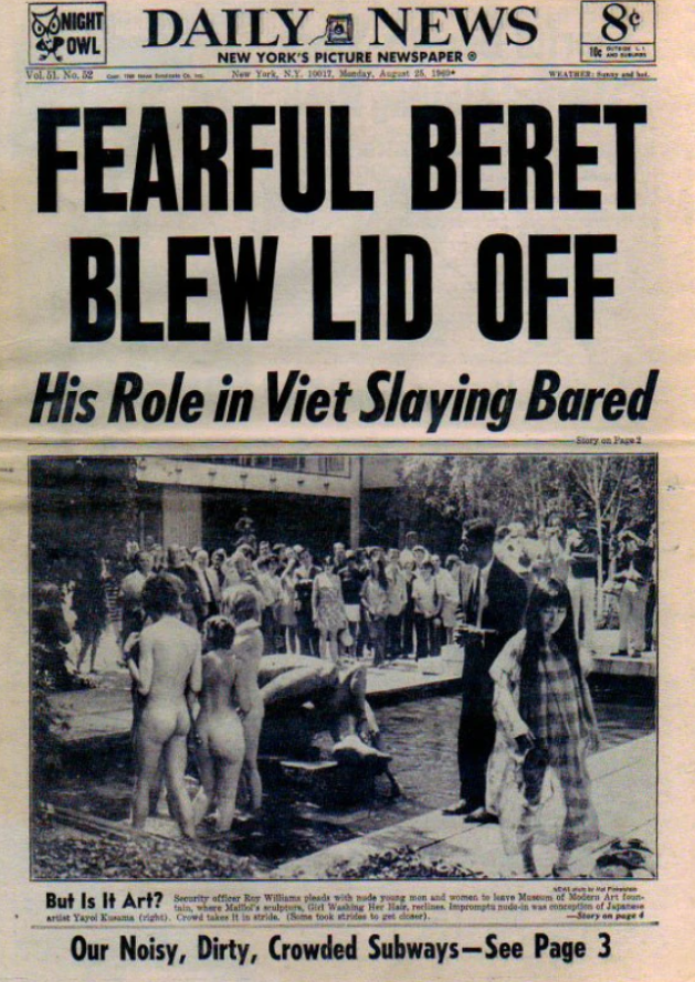 1968年10月15日,草间弥生首次在纽约证券交易所前进行了裸体舞者表演。草间弥生称“从这个机构赚来的钱让战争继续下去,我们抗议这种残忍和贪婪的战争机构”,偶尔会引起警察干预和逮捕,诸如此类未经授权的示威活动还发生在美国其他许多文化象征性场所:自由女神像前、中央公园爱丽丝梦游仙境雕像前,草间弥生在纽约现代艺术博物馆的雕塑花园喷泉表演参与者身上画点,被纽约每日新闻报道。