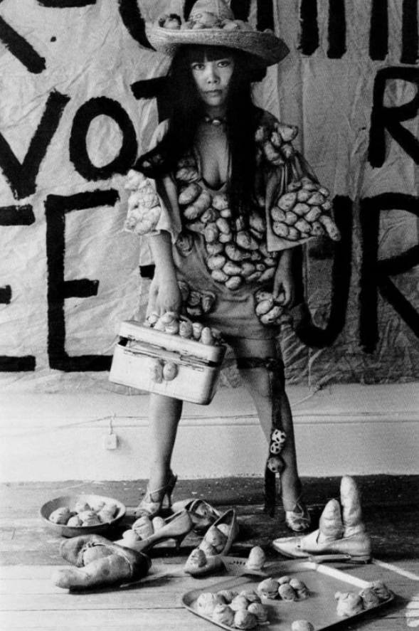 大约在同一时间,从1965年开始,她参与了许多引起媒体关注的未经授权的活动,主题多半是受嬉皮士运动影响的社会和政治意识,专注于回归自然和和平主义思想反对越南战争,其中暴力与激进主义相抗衡。这些表演在公共场合展示赤裸的身体,她自己作为女性艺术家在男性主导的社会中,作为日本人在西方艺术界和作为她自己的神经质和强迫症状的受害者,宣称要打破身份、性和身体的界限。