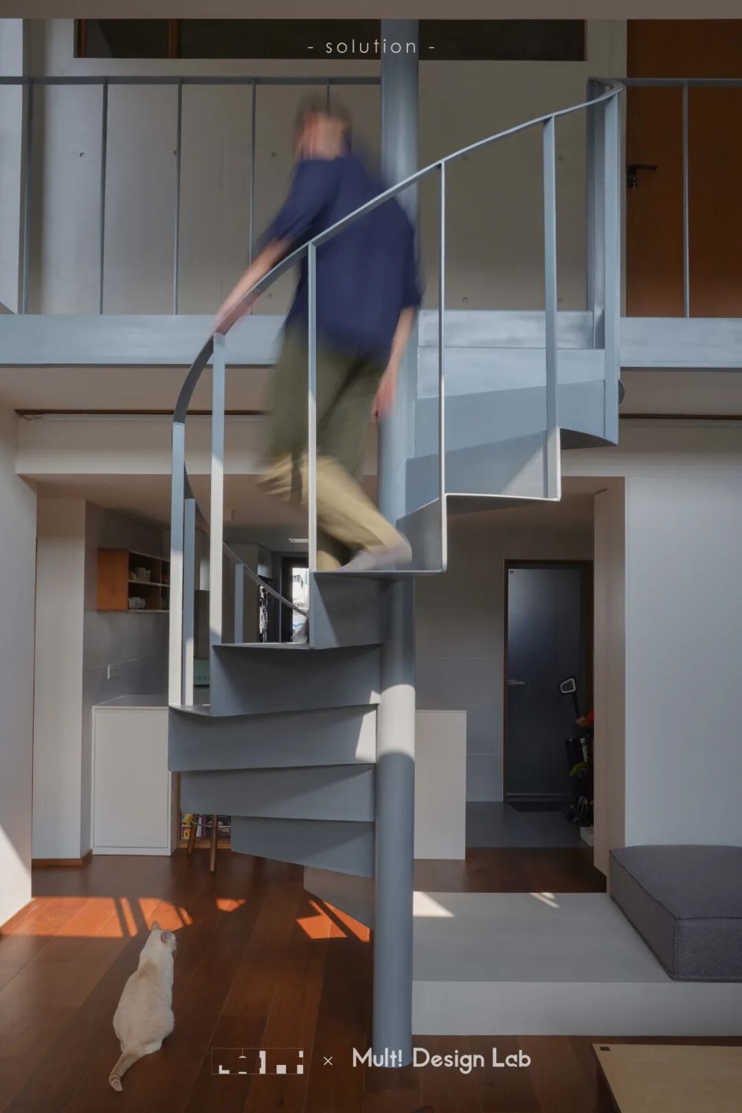 在本案中,“旋转的立柱楼梯”、“屋顶花园”、“横向的长窗”,以及清水混凝土效果的“粗野主义”风格,设计师通过自己的设计语言向建筑界的标杆人物致敬。