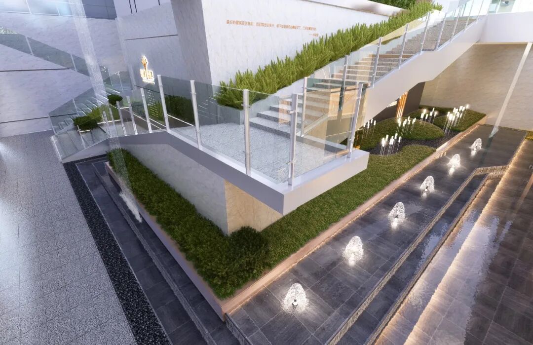 建筑的树形脉络倒映在镜面水景上,突显灯湖映树的艺术空间主题,穿孔板景墙的折线形态与透出星点的灯光投射在错落有致的层级跌水上。