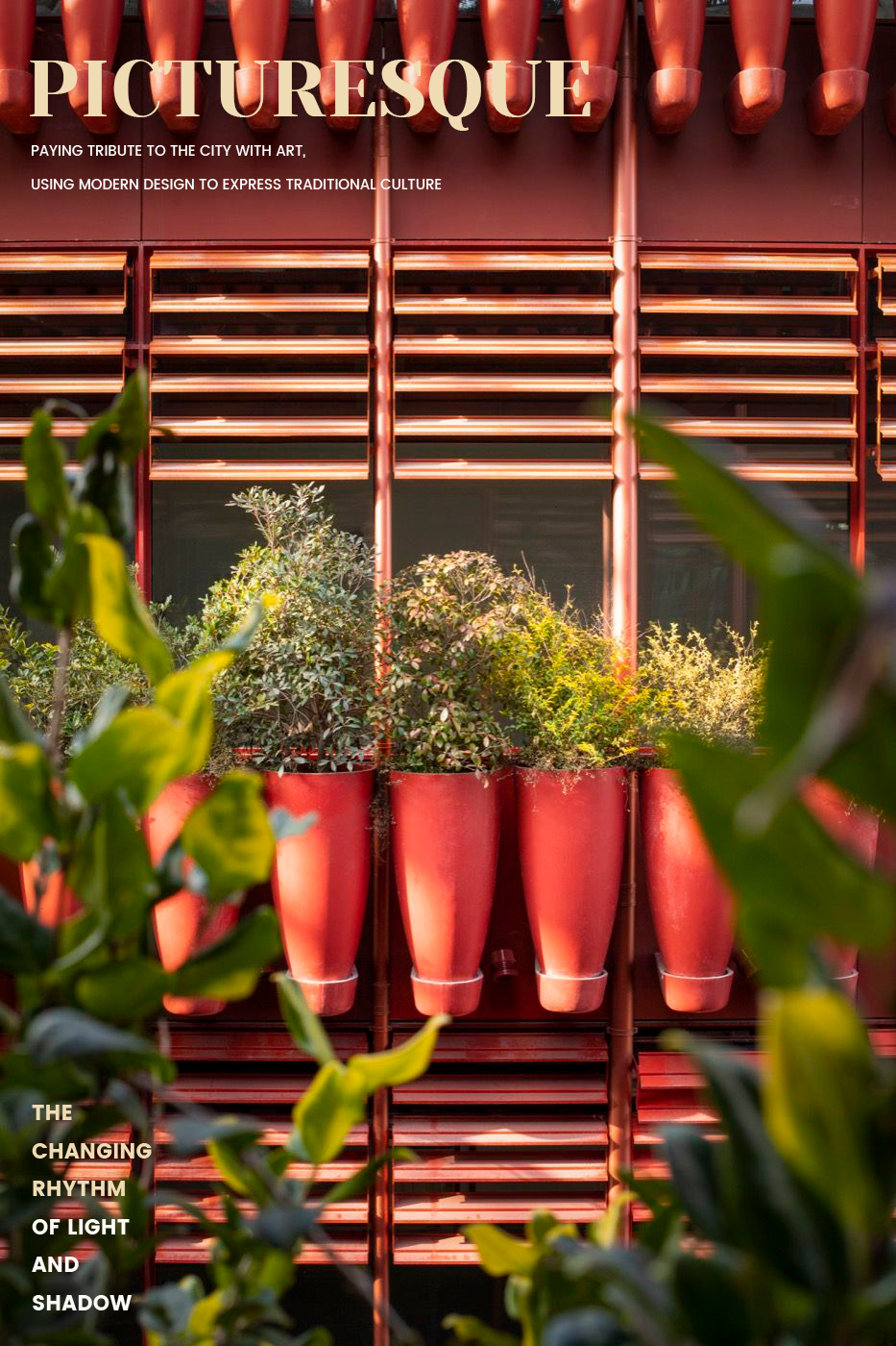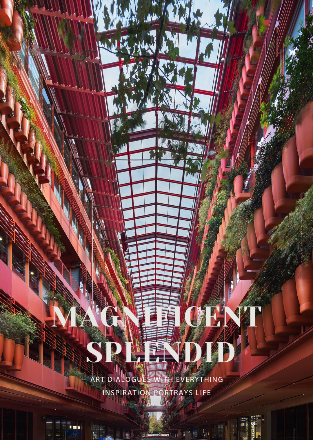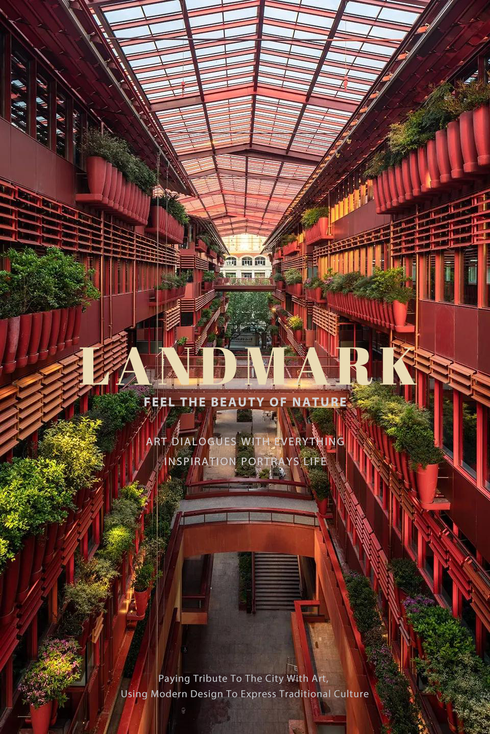 两层的商业店铺由数座小桥和道路相连,并被两堵特制的花墙所围绕。花墙上是种有不同植物的红罐,营造了一个色彩丰富的环境。