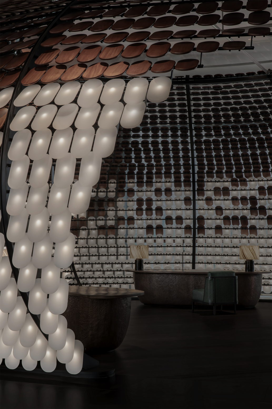 在统一的意境里,以“茧”为形,简约线条,竹编的艺术层层错落,回到人类的原点,在纯净无暇有如母体般的梦幻空间中孕育新生。