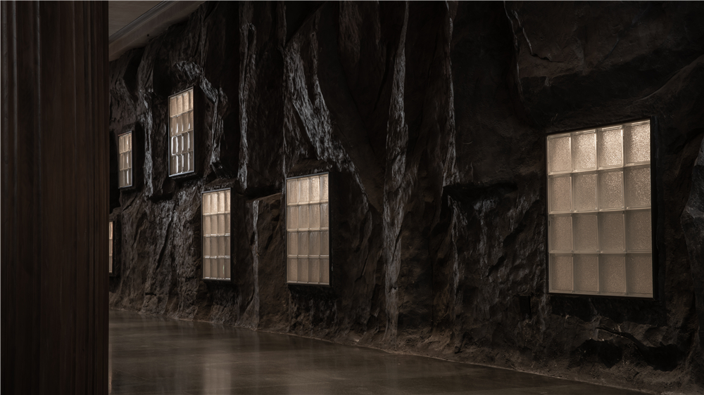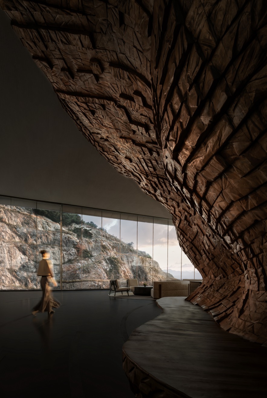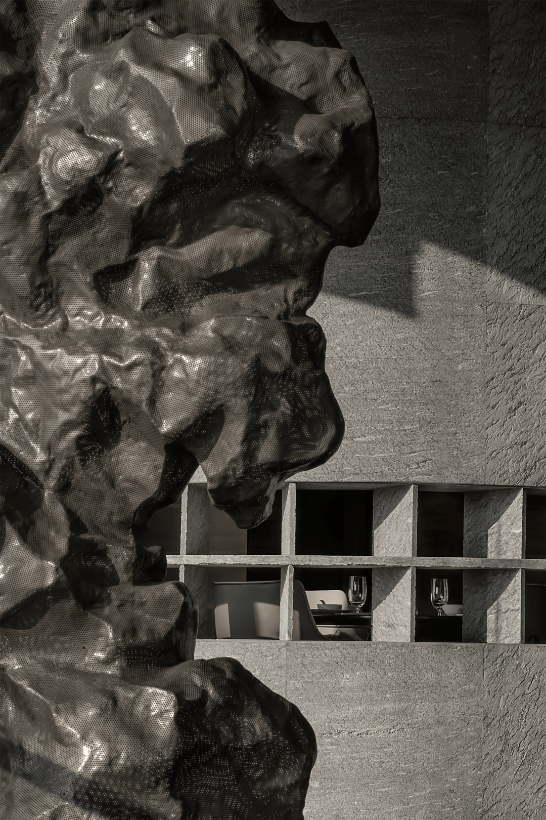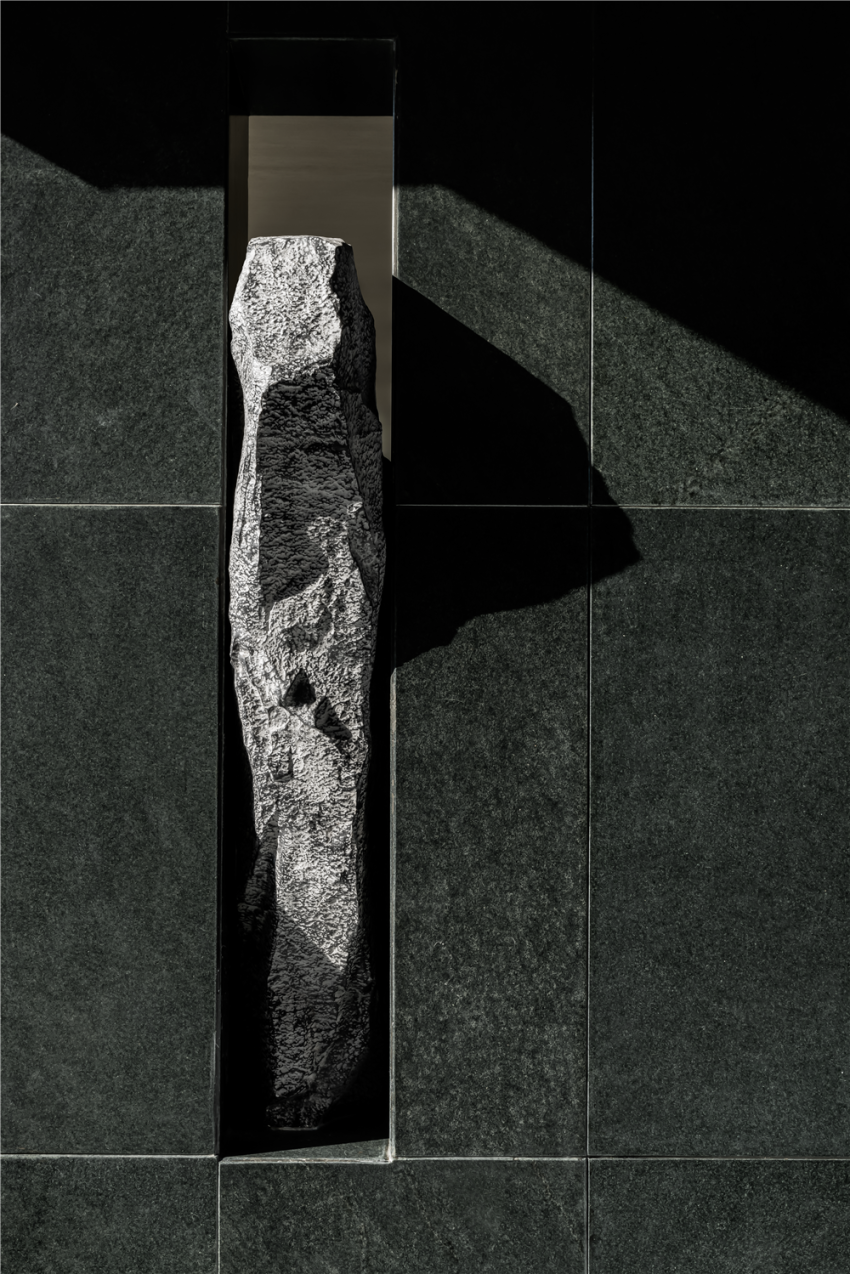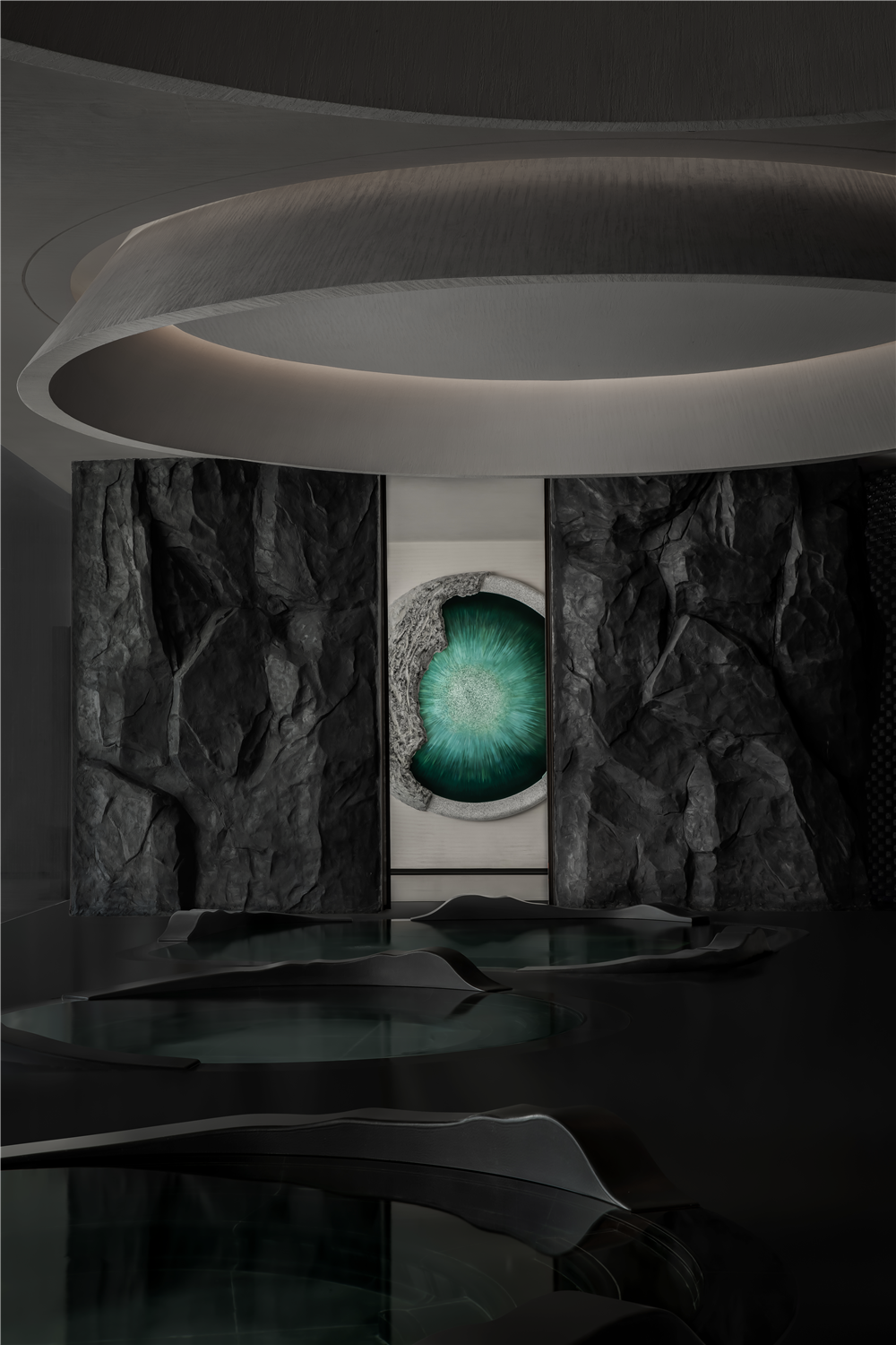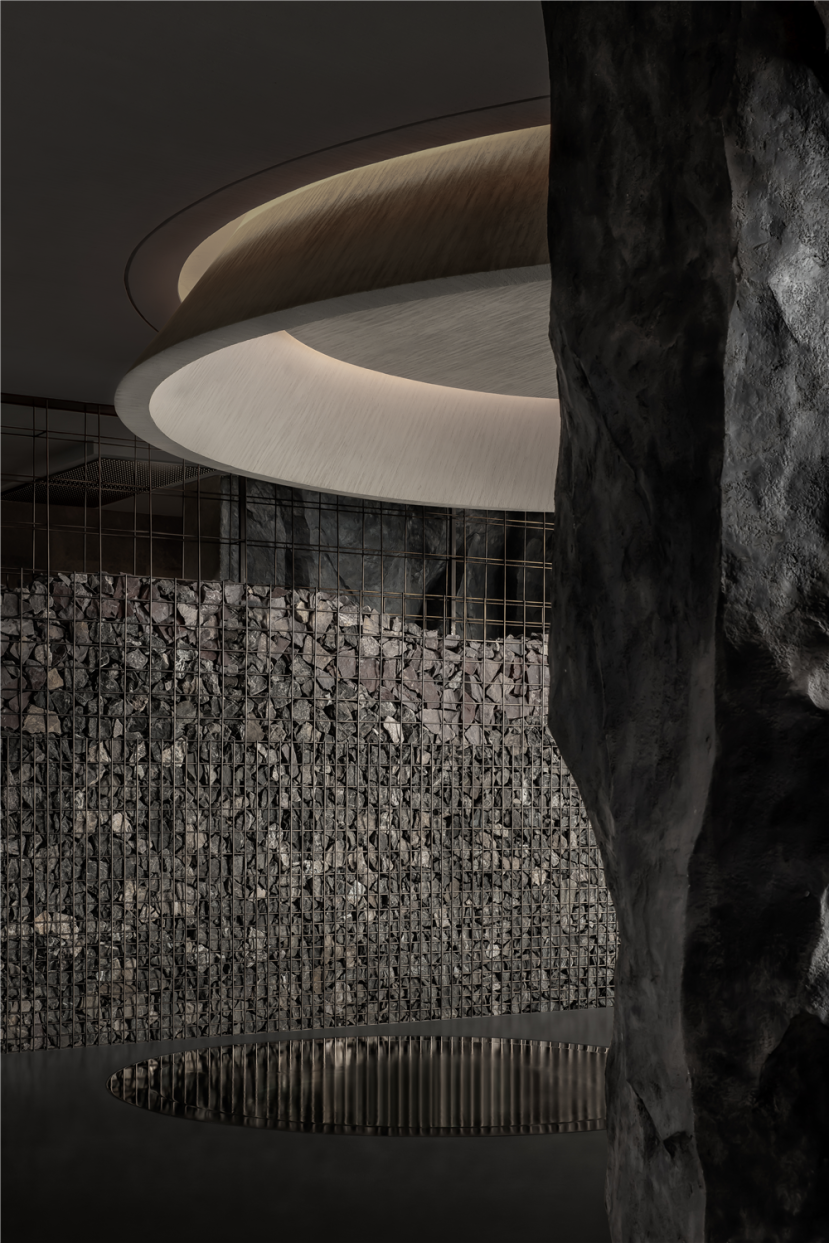 经过岁月洗礼,采石场地质岩层间已然悄然长成一副大自然鬼斧神工的山水画卷。设计师将自然的汤山山石介入室内,石块残缺坑洼的不规则表面,让室内与自然完全相融,同时勾连着自然地域的记忆。艺术品“汤山之眼”触发记忆开关,衔接起设计与人文的故事篇章。