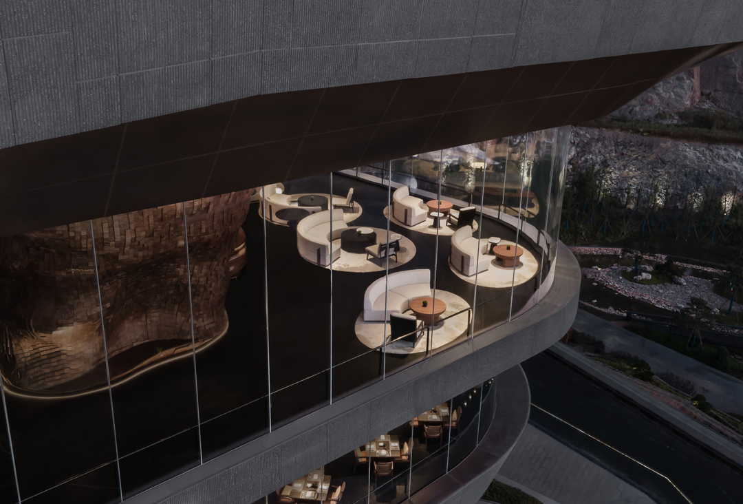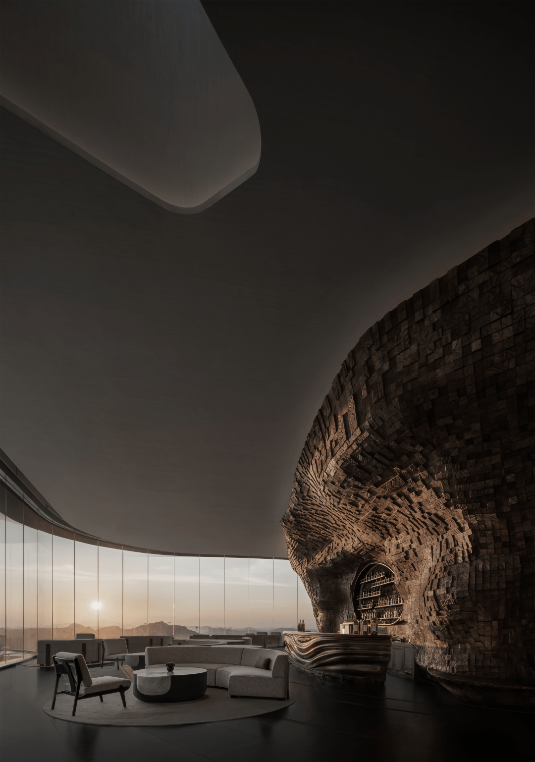 基于场地环境和设计初衷,CCD将“光之谷”形态融入大堂吧空间。基于峡谷的幽深和变幻,空间将体块进行曲面工艺切割,呈现自然的尺度和包容感。