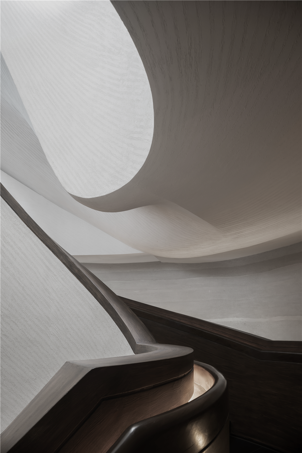 弧线造型使空间柔和圆润,通过对空间的重塑,给予破茧重生的蜕变感与惊艳感,又如同张开环抱的臂弯,赋予了空间家的归属感。行走其间的过程就是一场洗礼,人与自然的意识重启,从艺术到现实,从身体到心灵。