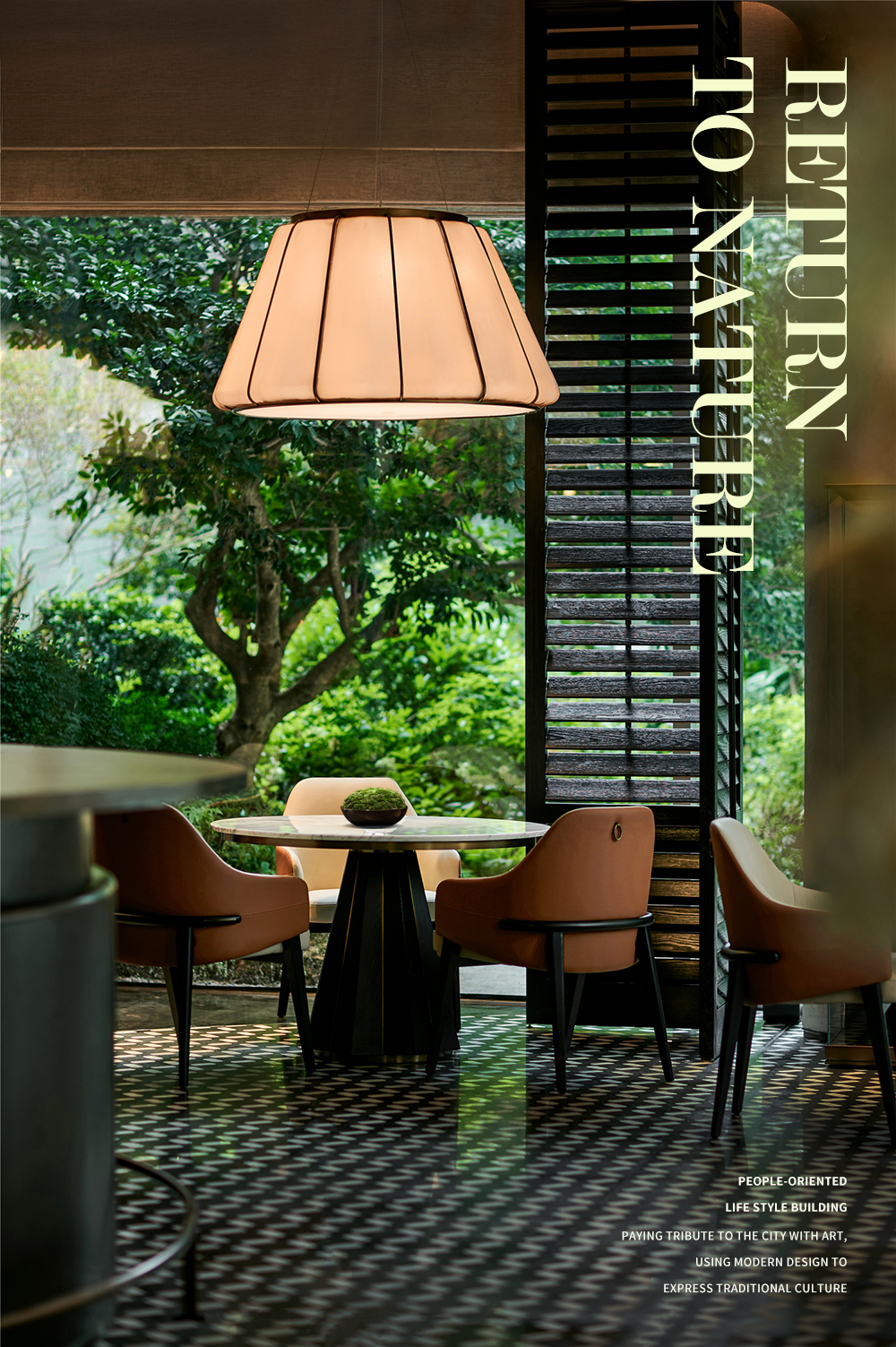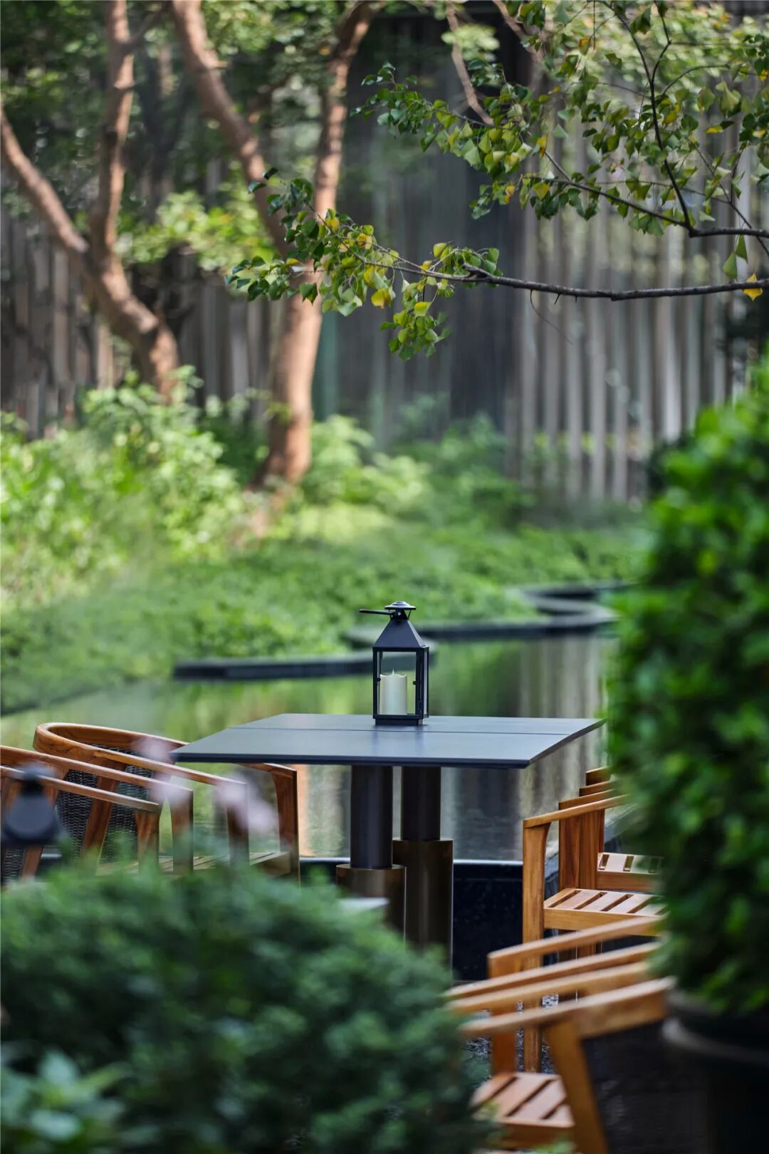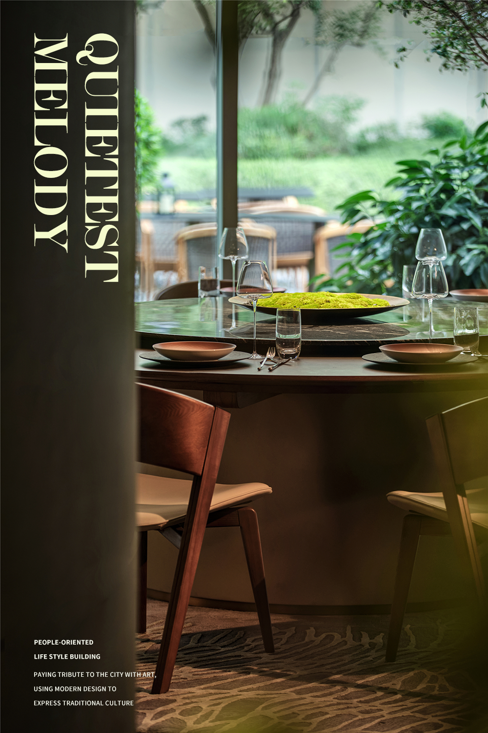 私宴餐廳構建出一隅藝術與自然互動的角落,落地窗無聲地接納自然光影,而極具藝術感的傢俱、飾品點綴著空間的內核。