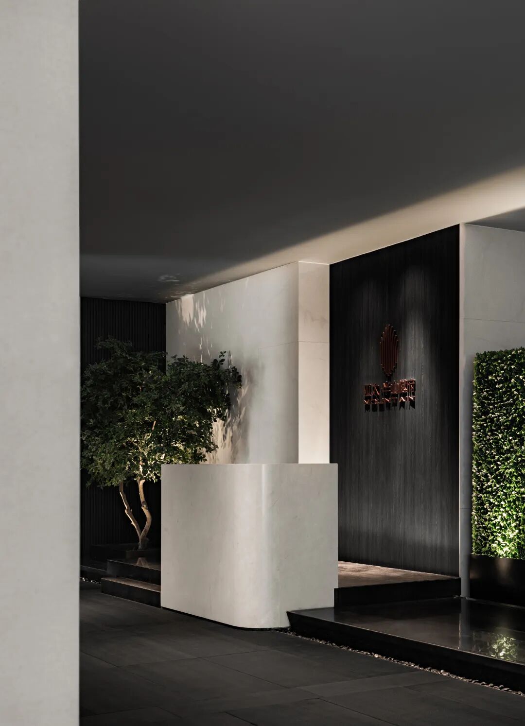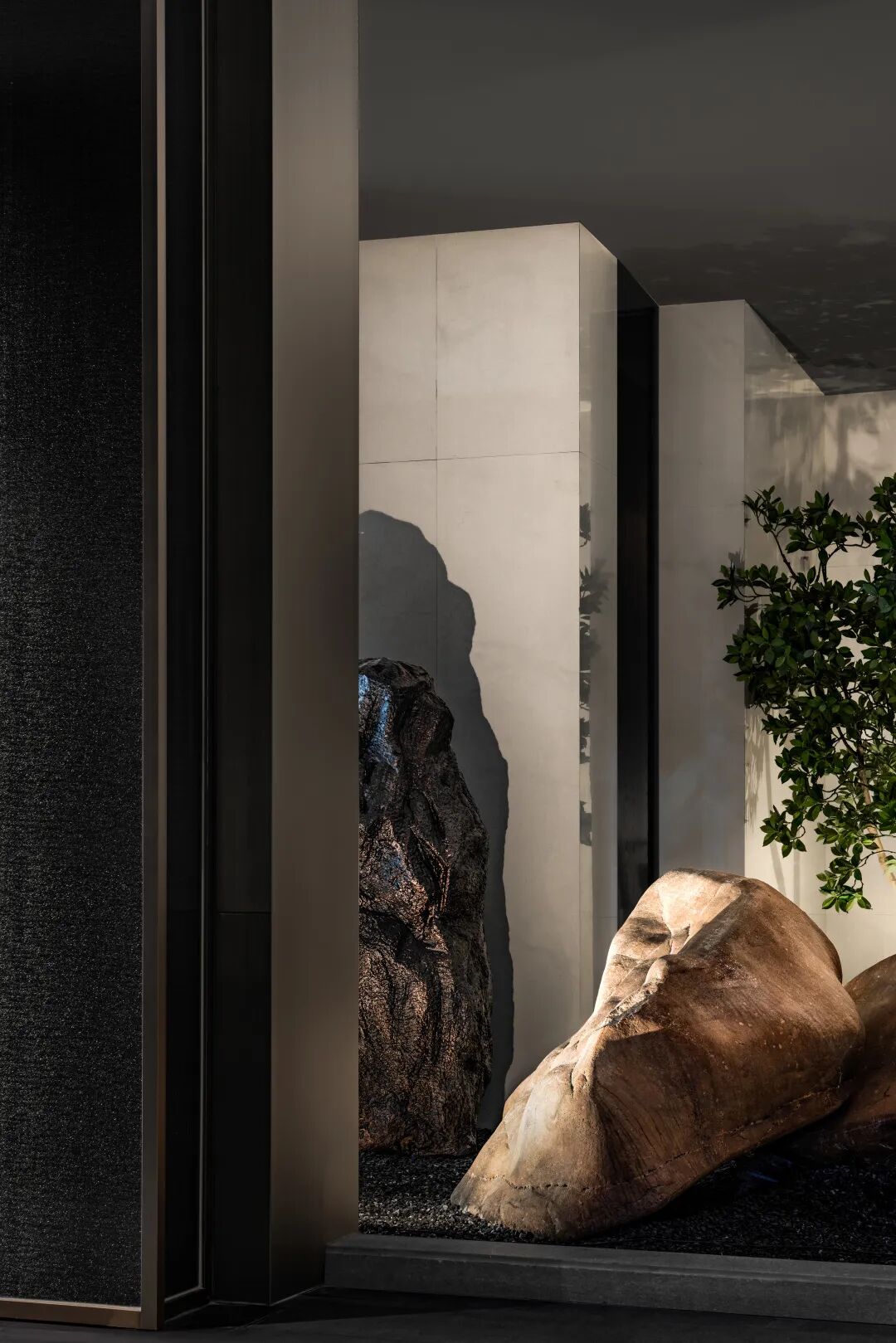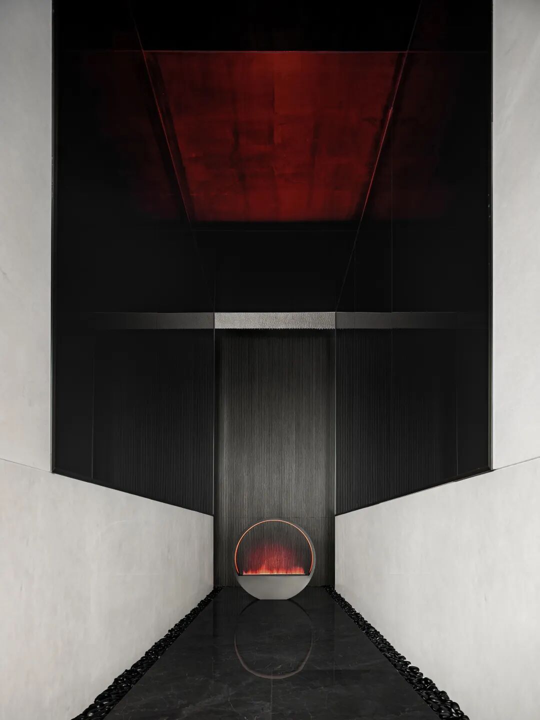 售楼中心位于一层,我们对整个地块进行规划,从前场开始规划营造,提升入口的尊贵感和私密性,运用树木的围合感、水景的静谧感,加上火炉的氛围烘托,打造出一个富有仪式感的入口前厅,让人们的内心沉静,提升场景的品质感。
