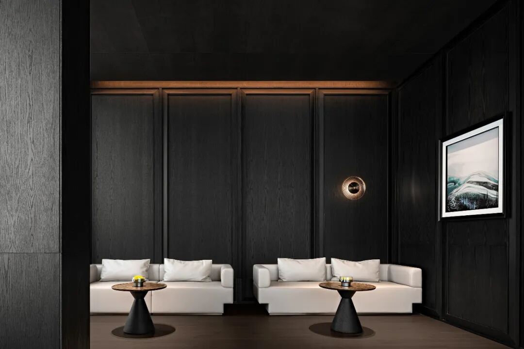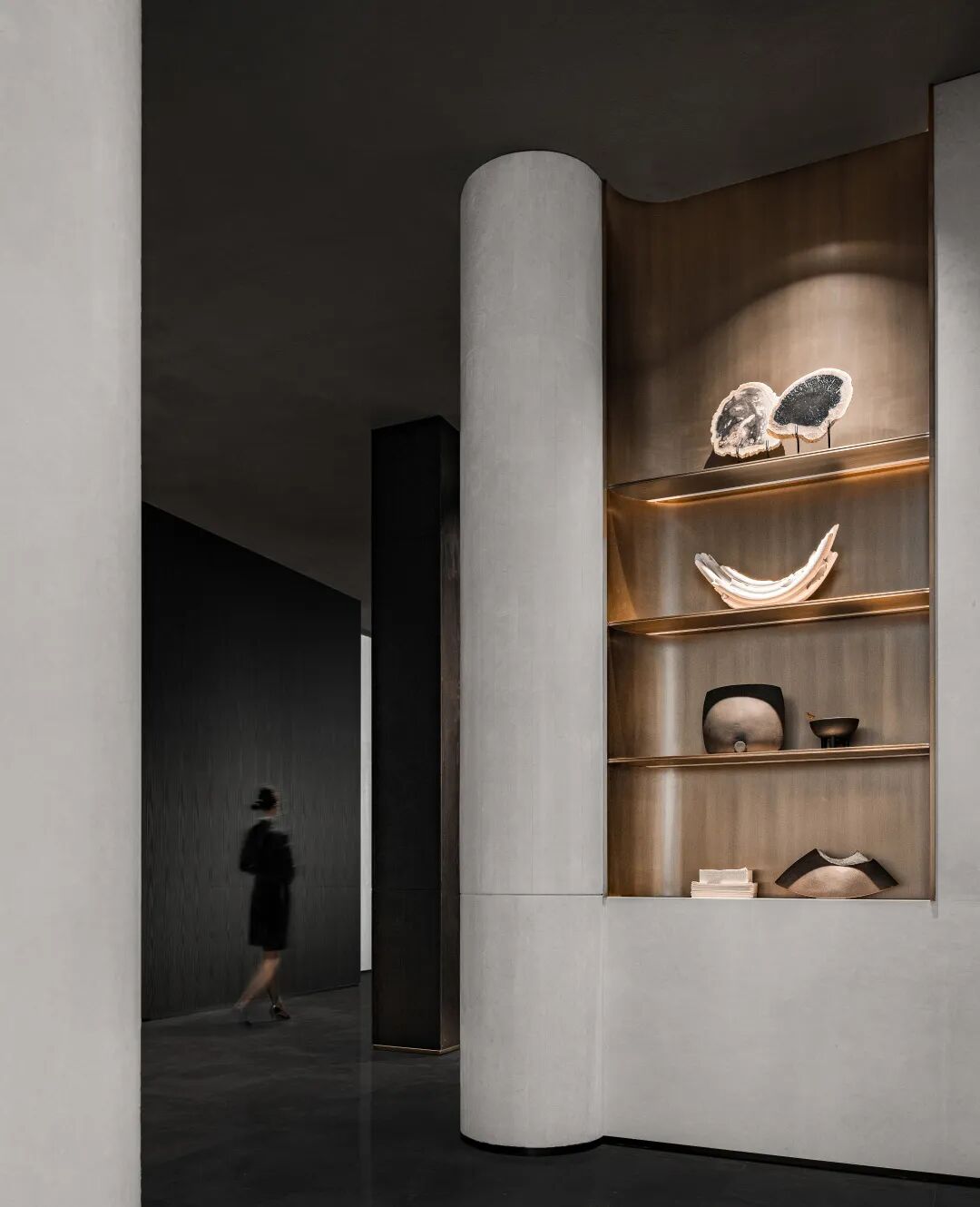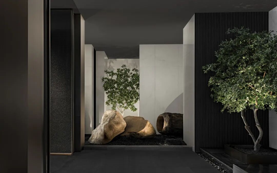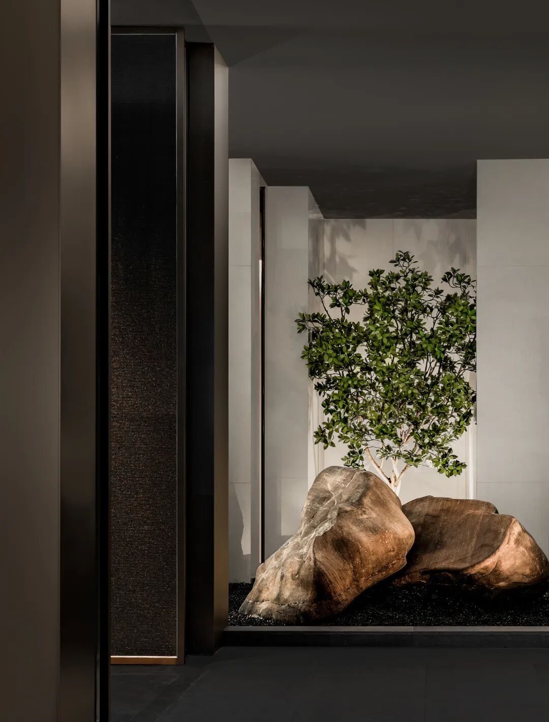售楼中心位于一层,我们对整个地块进行规划,从前场开始规划营造,提升入口的尊贵感和私密性,运用树木的围合感、水景的静谧感,加上火炉的氛围烘托,打造出一个富有仪式感的入口前厅,让人们的内心沉静,提升场景的品质感。