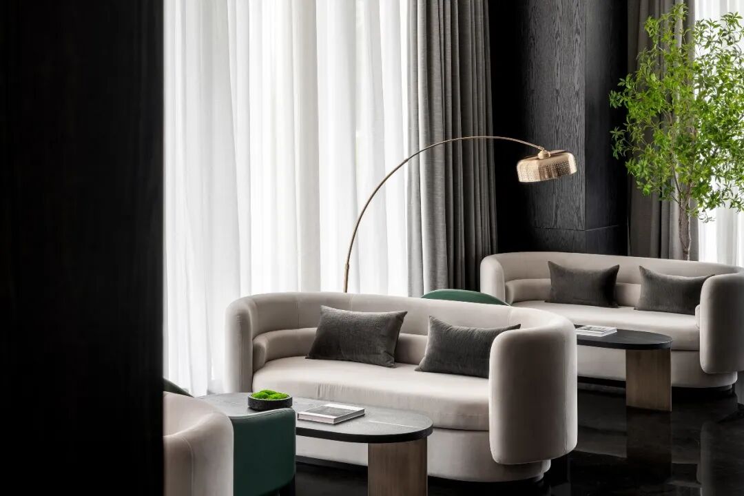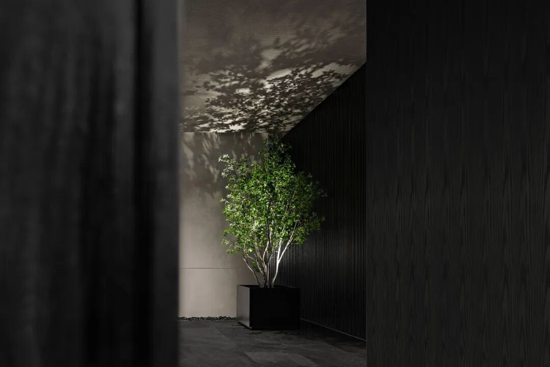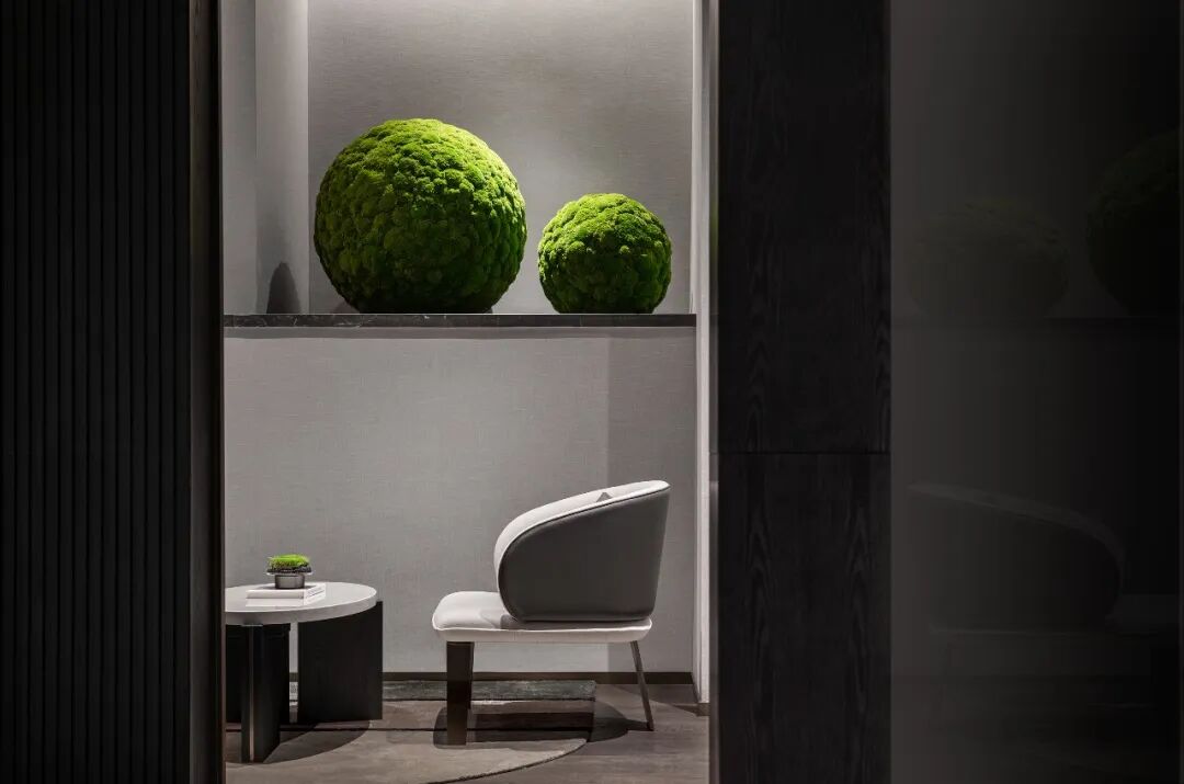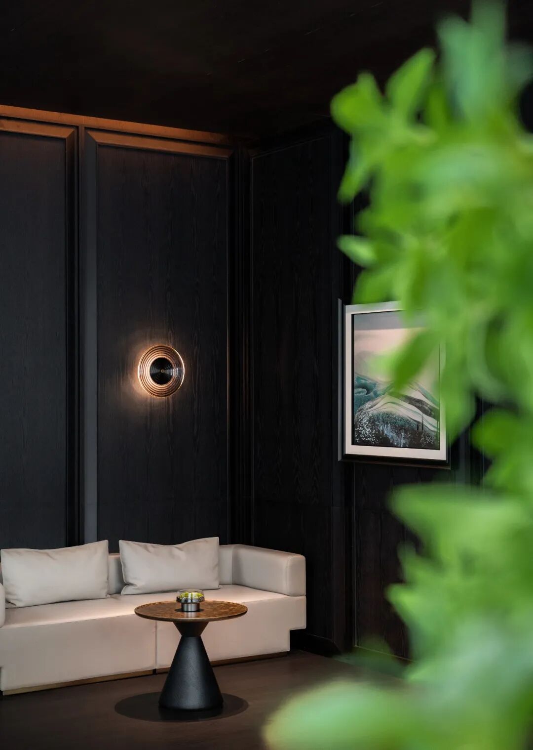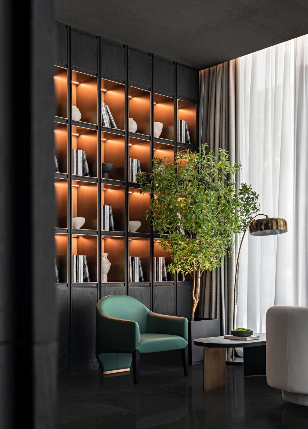 在场景转换过程中,我们加入绿植作为空间的划分,灯光照射到树木,斑驳的光影倒映在天花,让室外的景观在室内延伸,增添了空间的生气与趣味。后半部分的洽谈区,我们希望空间可以更加热闹和活跃,手法上也加入了不同的设计元素。另外,我们从颜色上进行了跳脱,在整个基调不变的基础上,在软装中加入了古典红作为跳色。