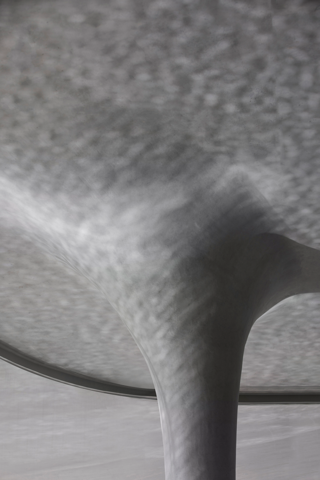 作为主要形象的建筑上部主体部分,采用气质淳朴的白色混凝土,利用其可塑性,造型遵循自然的形态,突出其在地生长的力量和勃勃生机。其间设置大片通透流线型玻璃和天窗连接室内外天空及地上地下,形成丰富的光影效果:上层的地面和水池均采用深色大理石,室内外一体,营造出水面和空间的延伸感,将滇池之水流动的形态贯穿其间;水池同样开设了孔洞,成为二层泳池空间自然的采光天窗,引入光线的同时,在水中映射出羽毛般自然轻柔的形态。