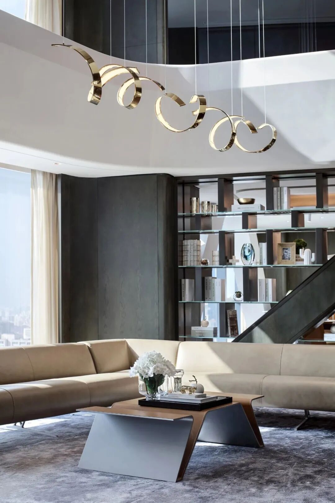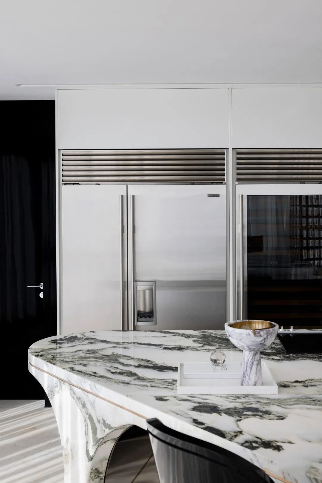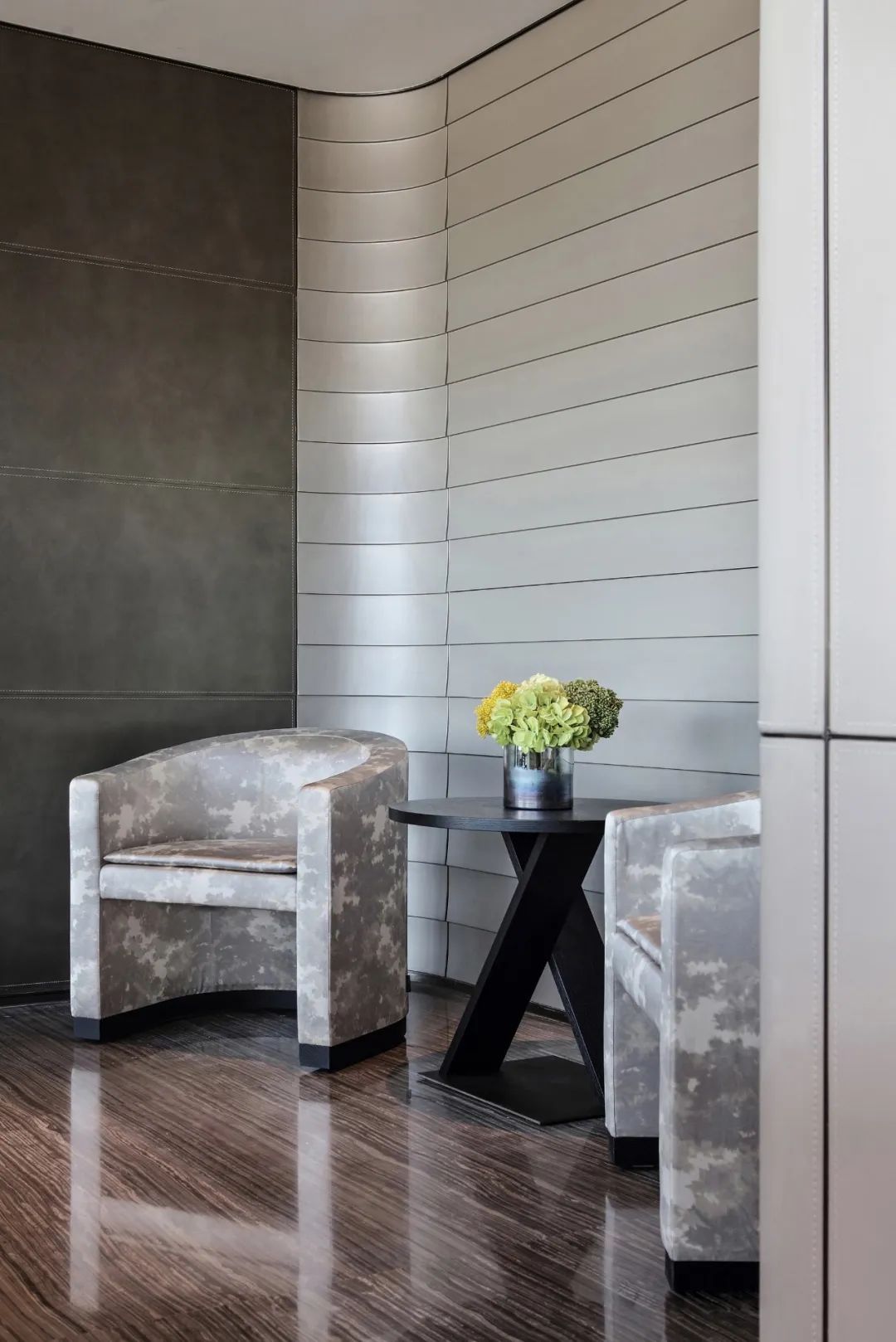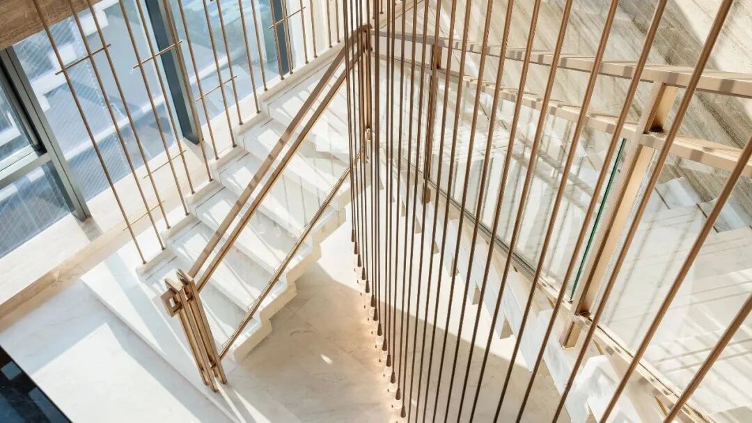 線條立面連至天花,傢俱的每一處動線皆是首尾呼應,空間中處處是對流線的著墨講究。