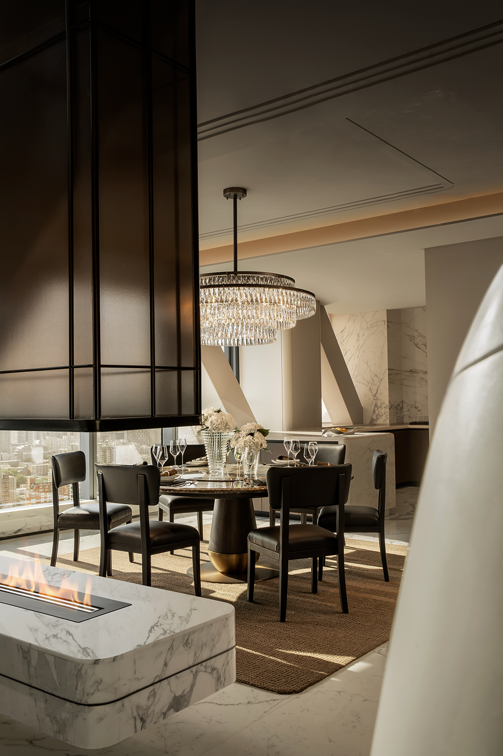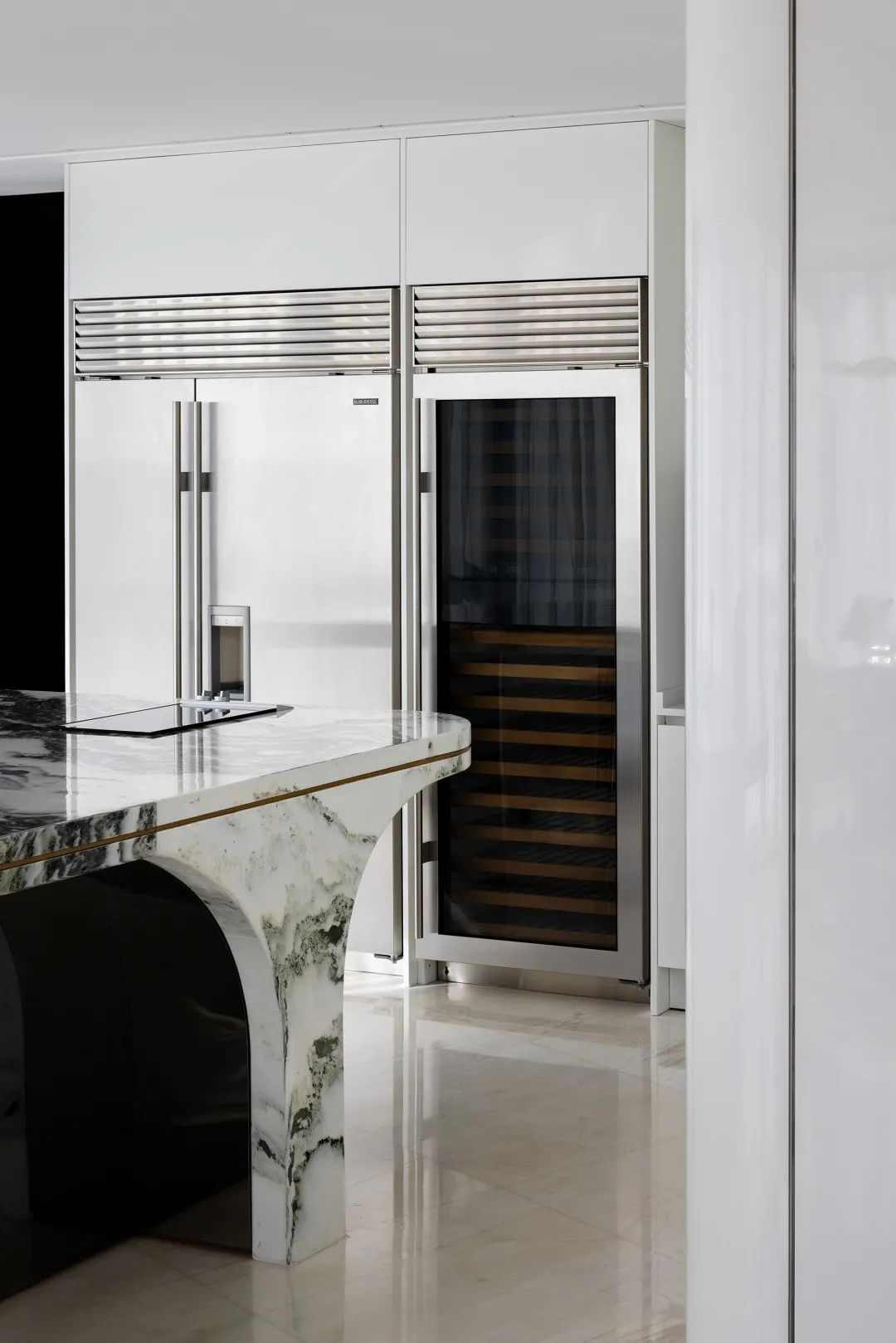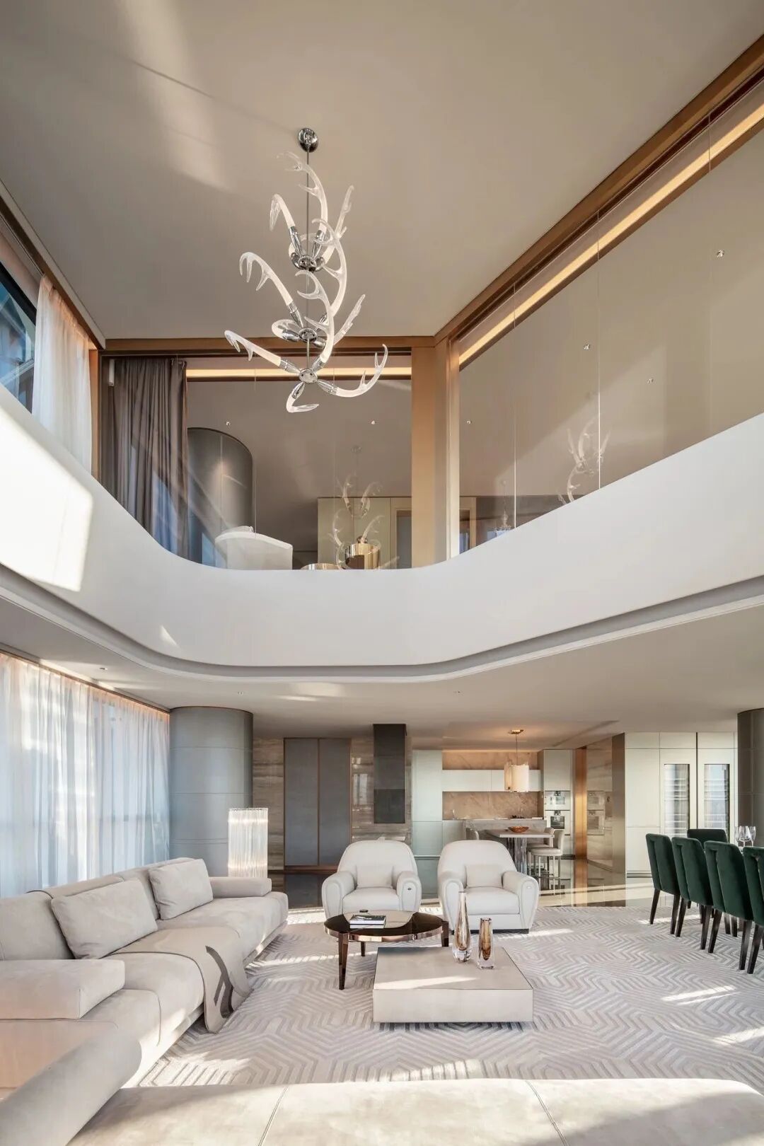 線條立面連至天花,傢俱的每一處動線皆是首尾呼應,空間中處處是對流線的著墨講究。
