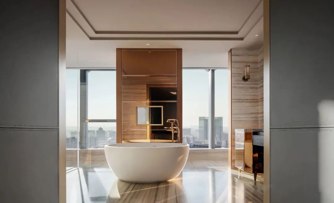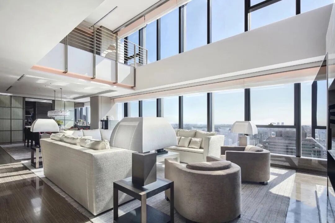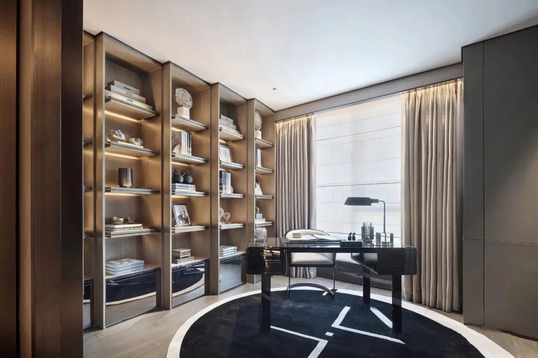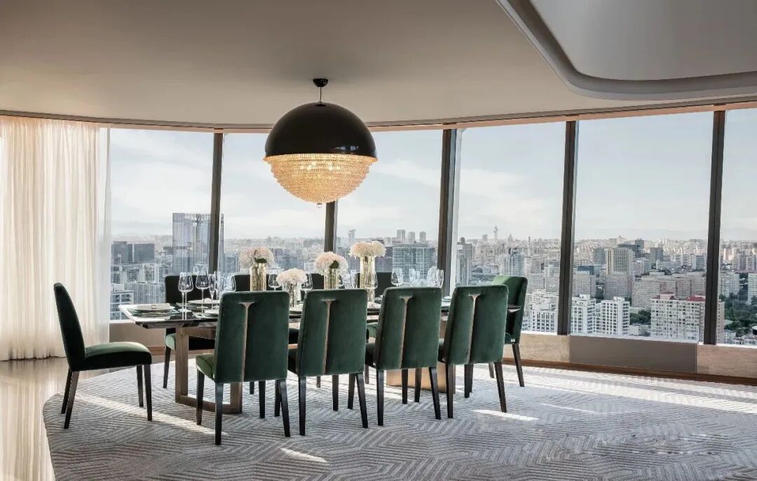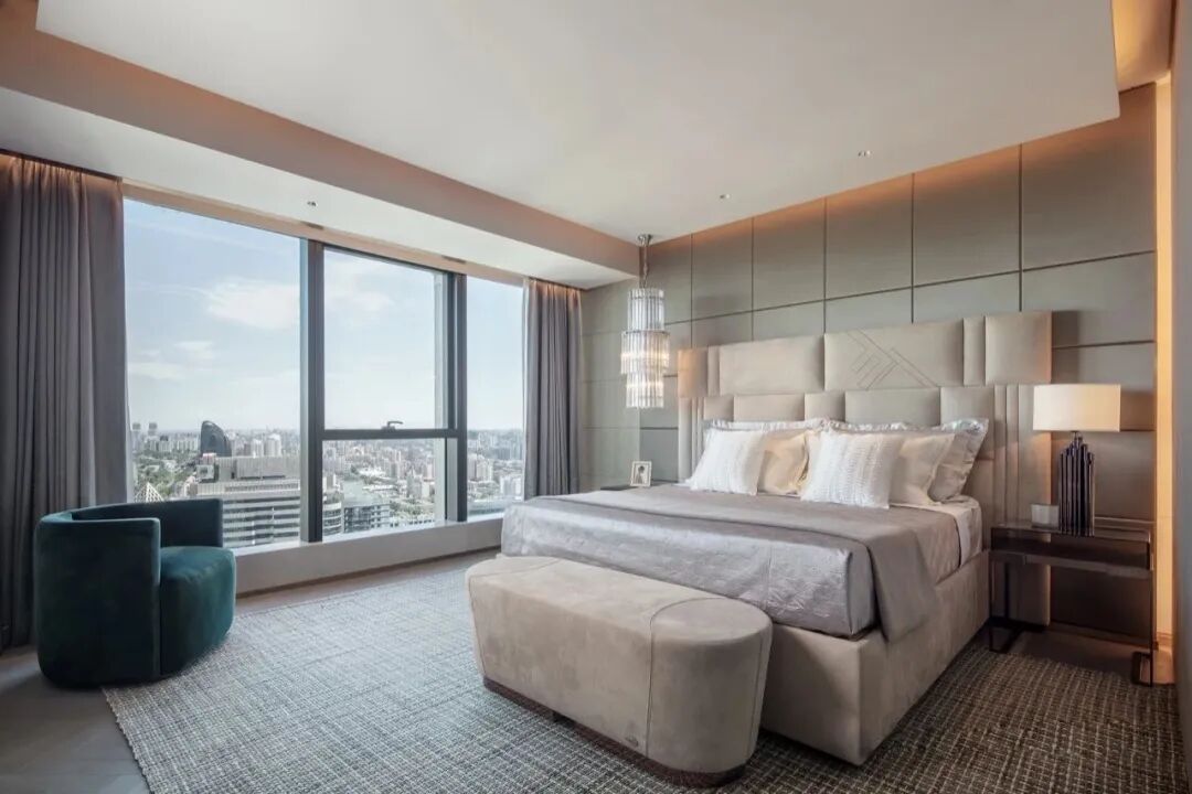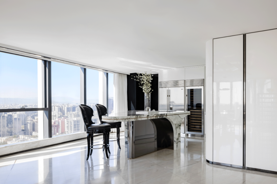 整面通透的玻璃窗,飽覽北京的城市天際線。空間利落的線條,簡潔的配色,對稱的結構布局,以最簡化線條,彰顯出端莊大方的空間氛圍。木紋中心拼花櫃子,精致的外表下有著極強的存儲能力。具有設計感的同時兼顧實用性能。
