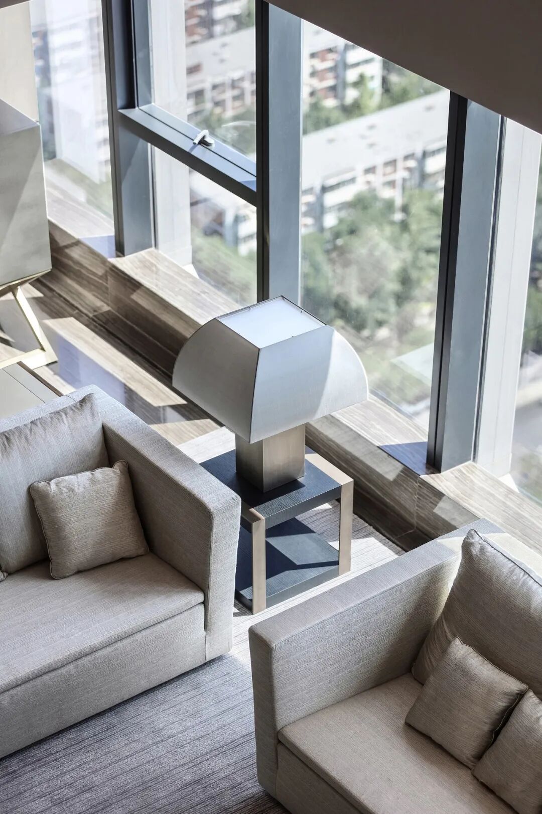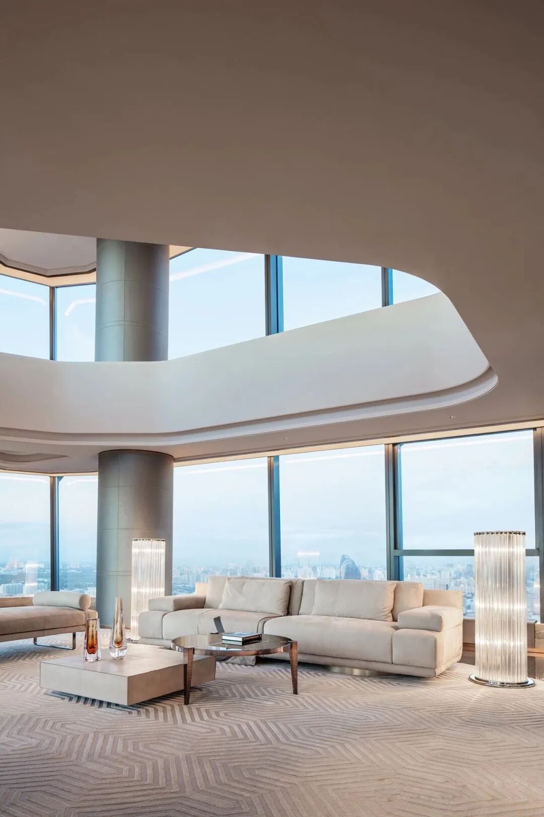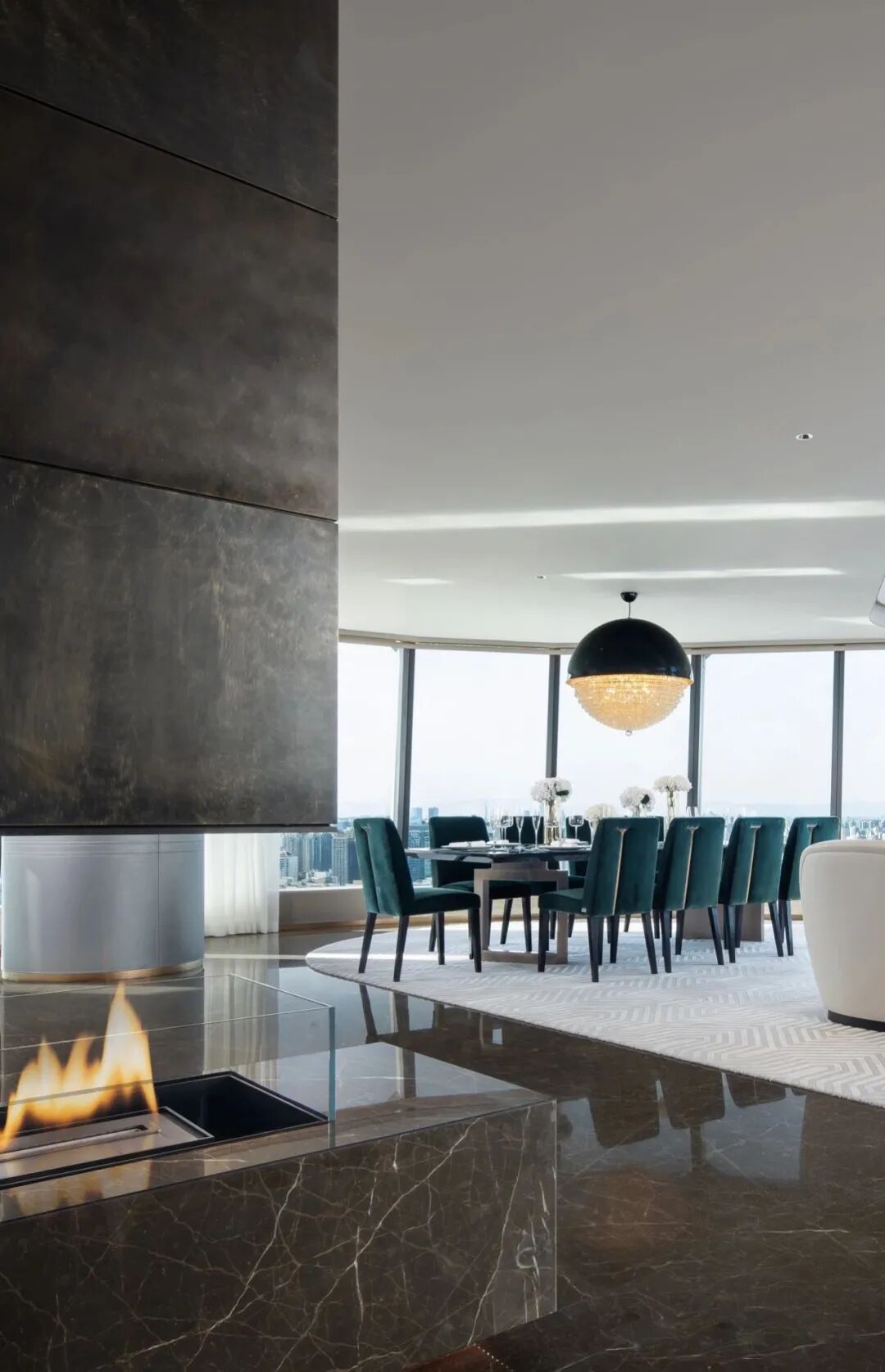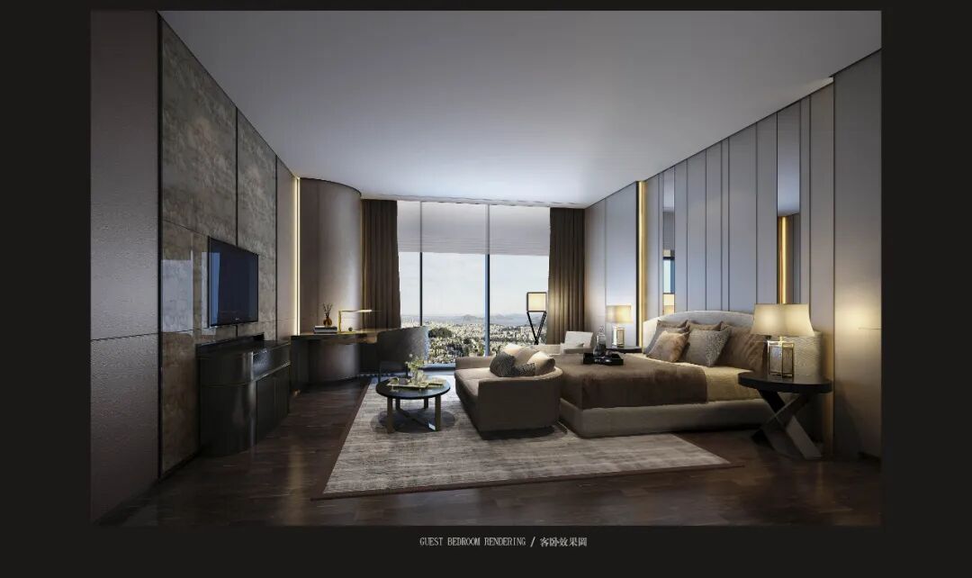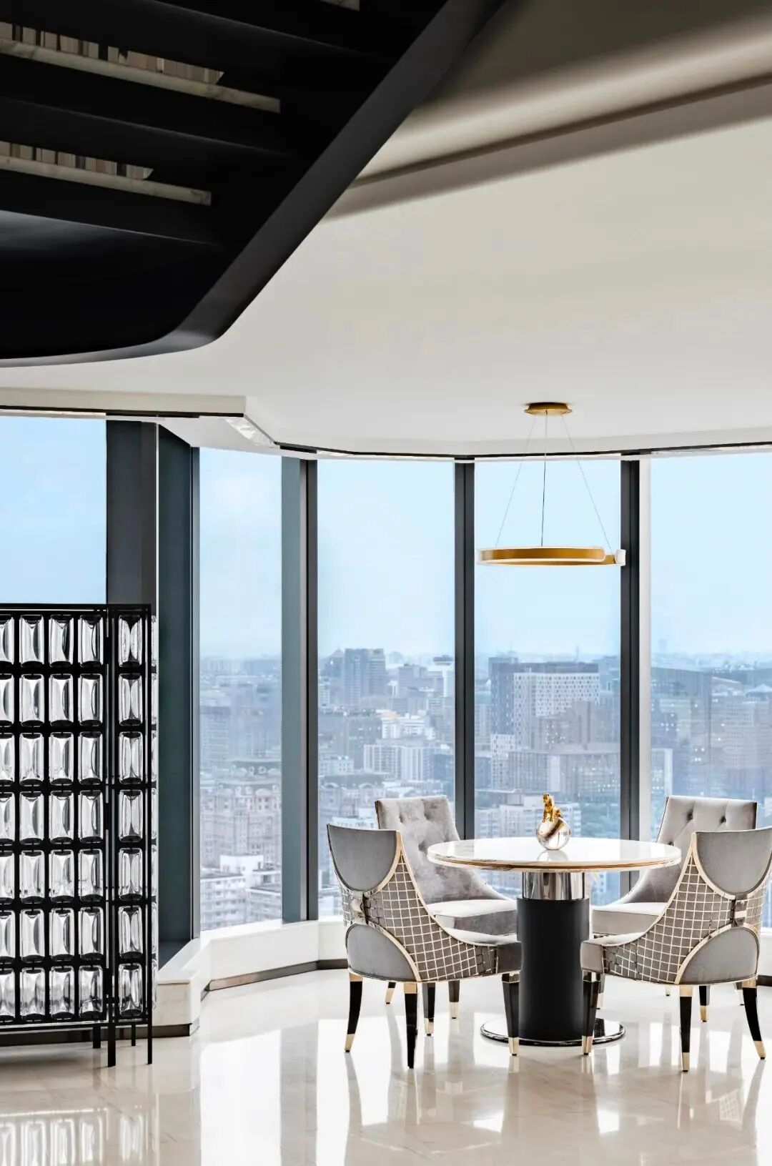 整面通透的玻璃窗,飽覽北京的城市天際線。空間利落的線條,簡潔的配色,對稱的結構布局,以最簡化線條,彰顯出端莊大方的空間氛圍。木紋中心拼花櫃子,精致的外表下有著極強的存儲能力。具有設計感的同時兼顧實用性能。