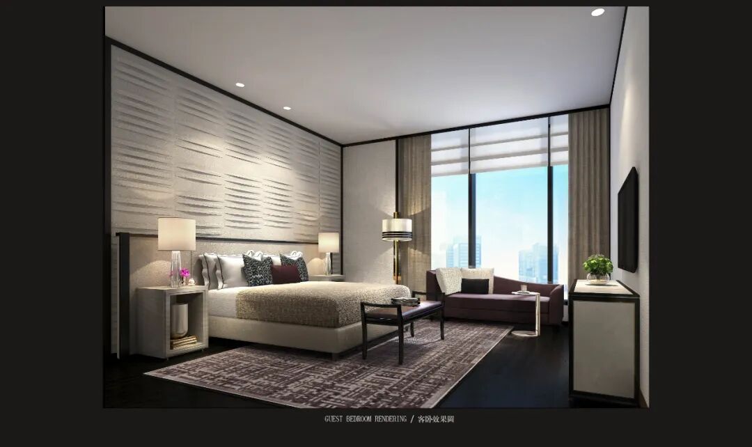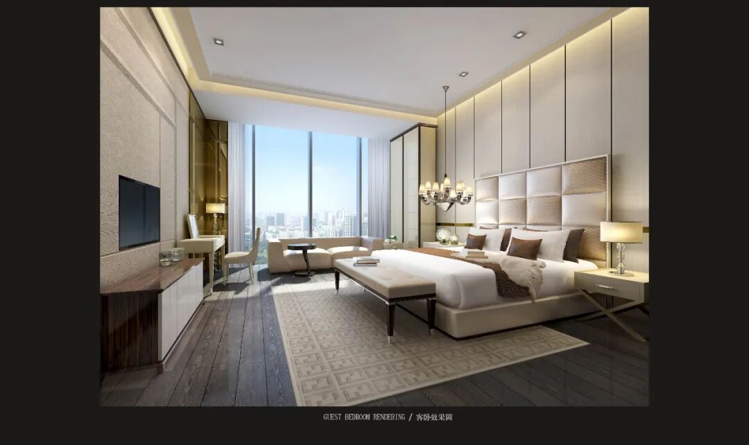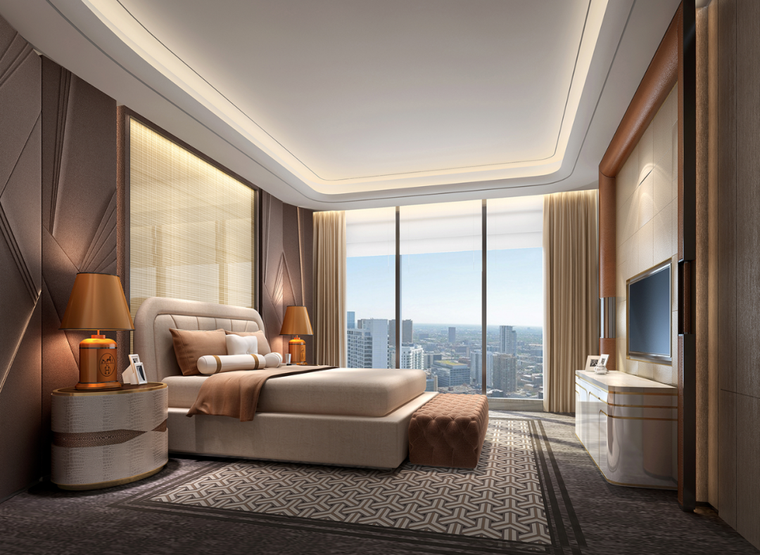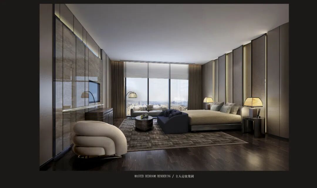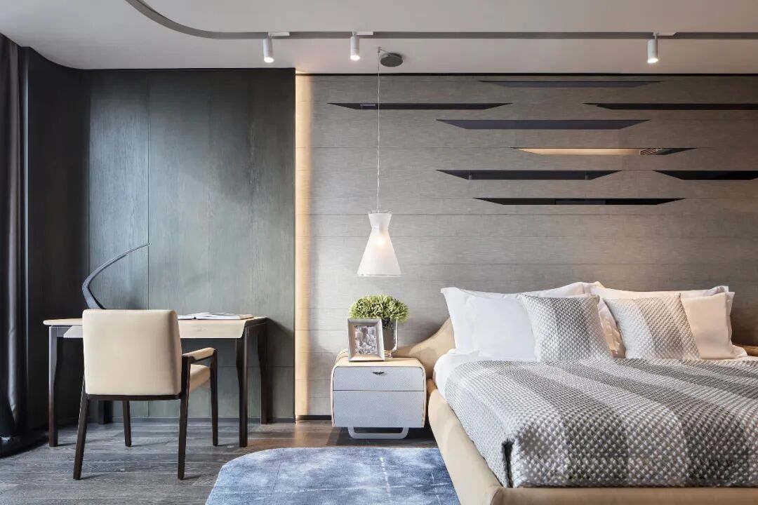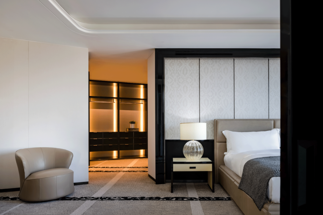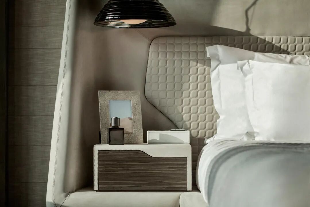 轉角處以弧度銜接,減少空間的淩厲感,每條曲線都遵循恰到好處的角度,伴隨著燈光的流轉徜徉,交織出曼妙優雅的基調。空間家具在浮雕中呈現出東方植物裝飾性的不規則紋理,高支數緞面確保了奢華的觸感,成為舒適與別致的縮影。