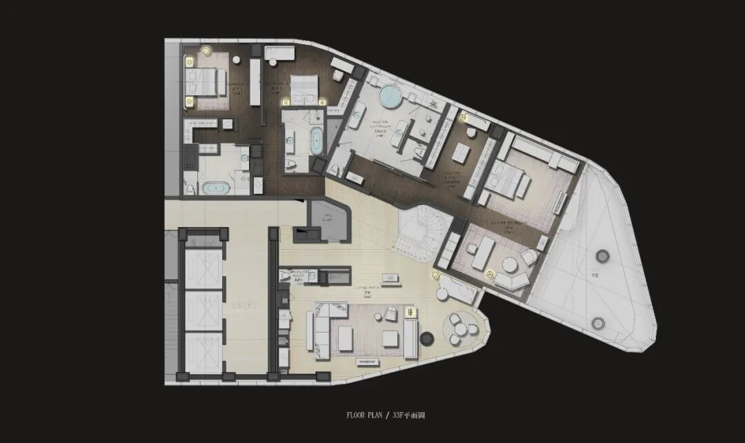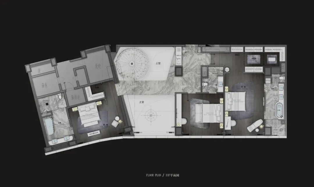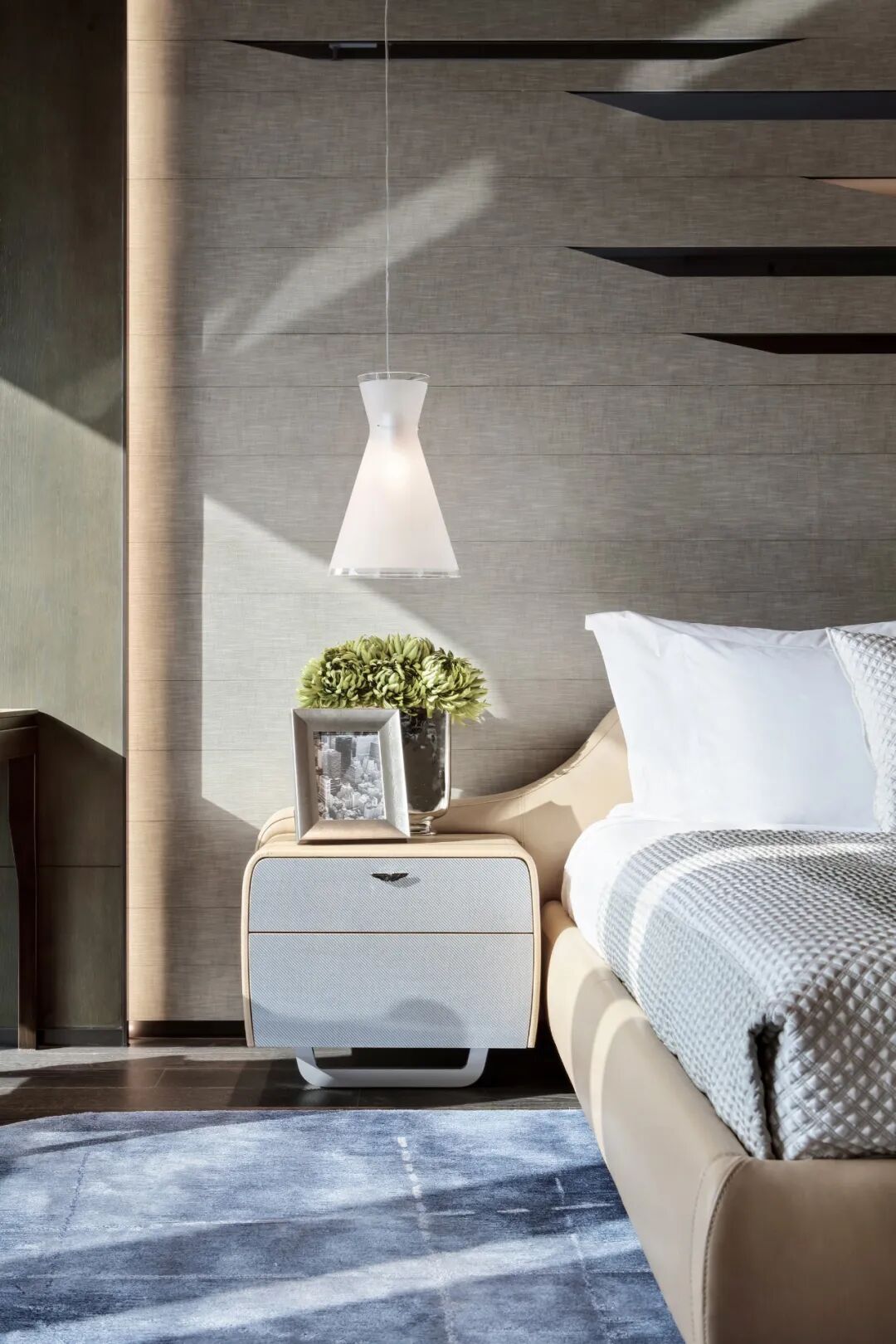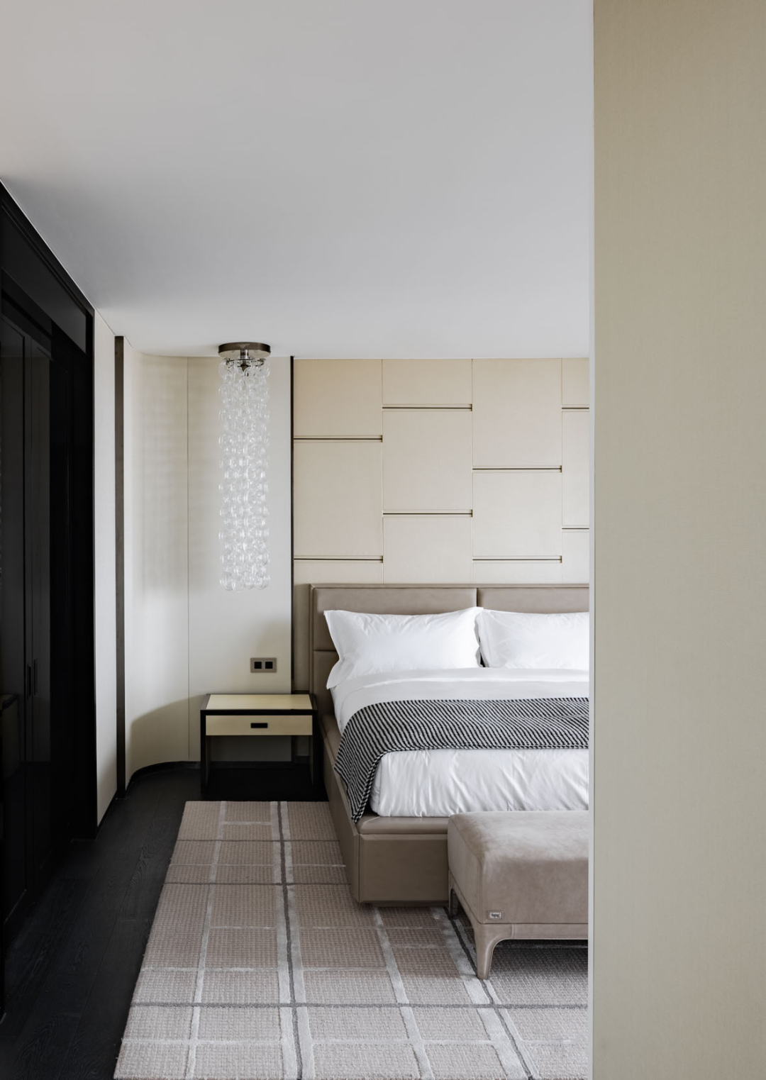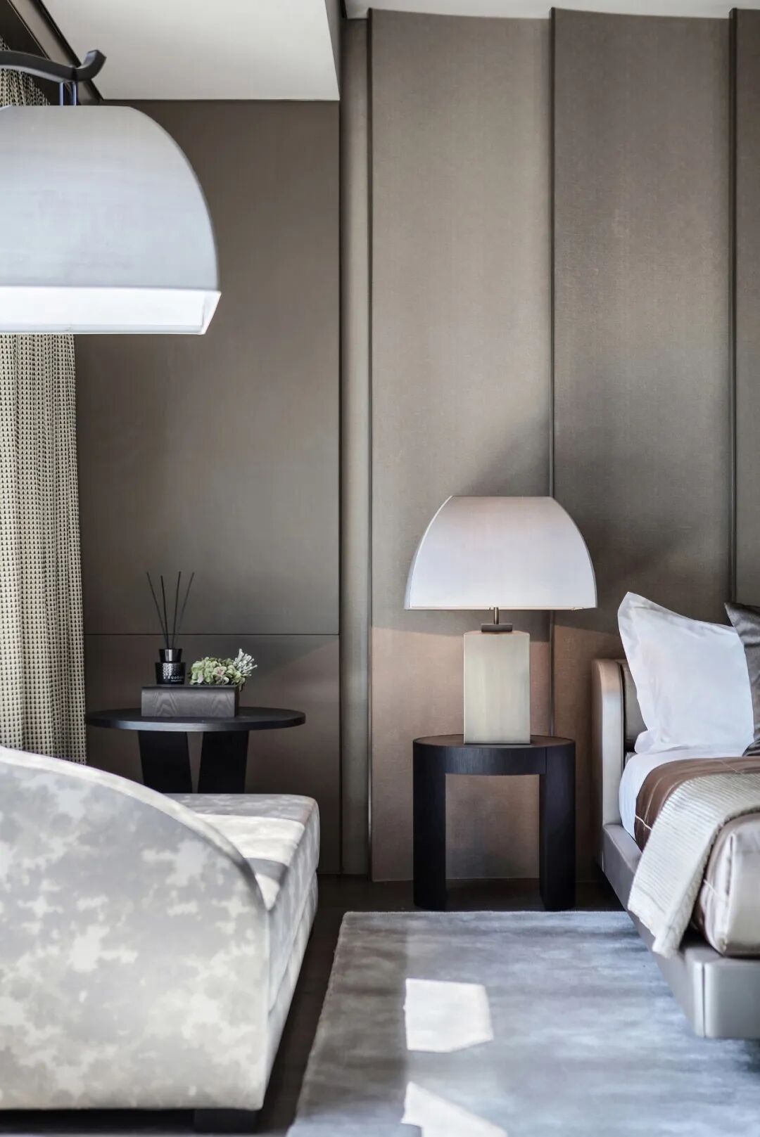 轉角處以弧度銜接,減少空間的淩厲感,每條曲線都遵循恰到好處的角度,伴隨著燈光的流轉徜徉,交織出曼妙優雅的基調。空間家具在浮雕中呈現出東方植物裝飾性的不規則紋理,高支數緞面確保了奢華的觸感,成為舒適與別致的縮影。