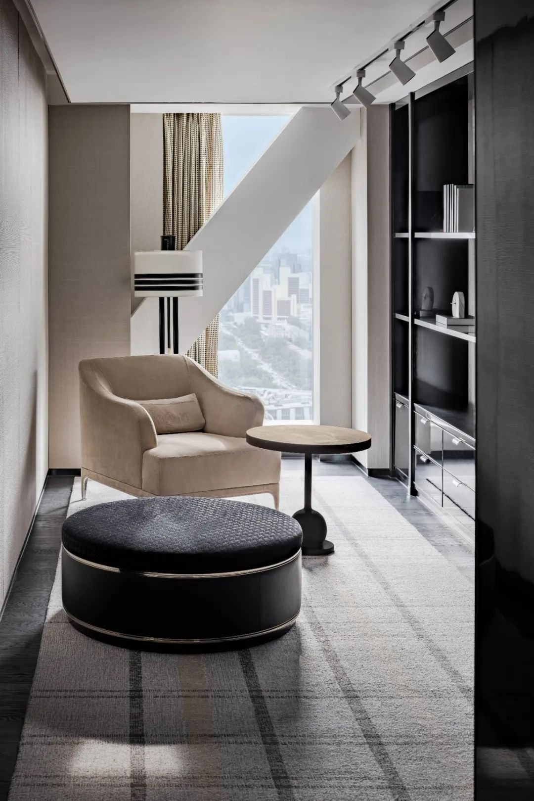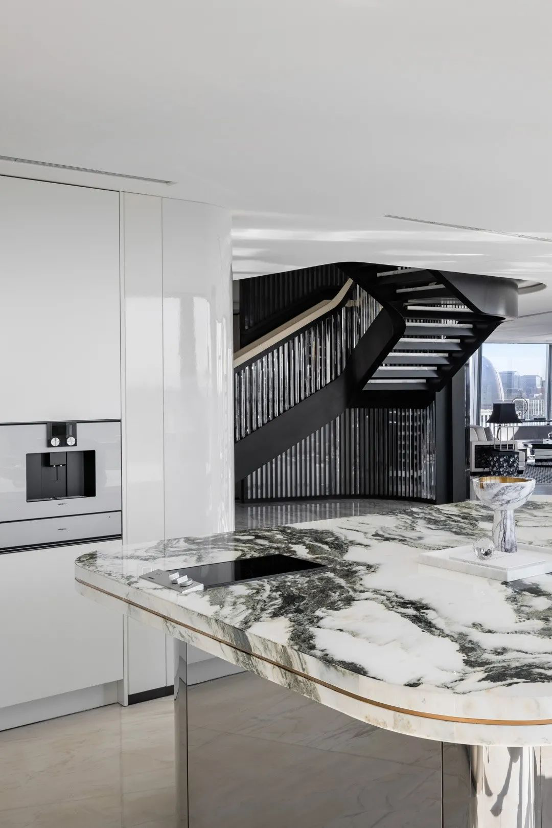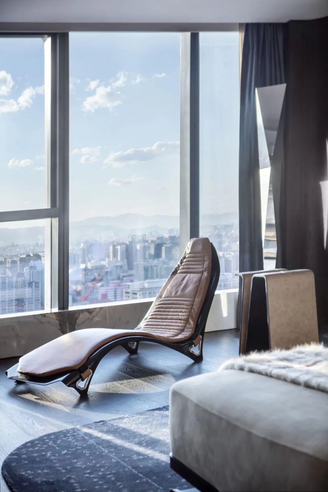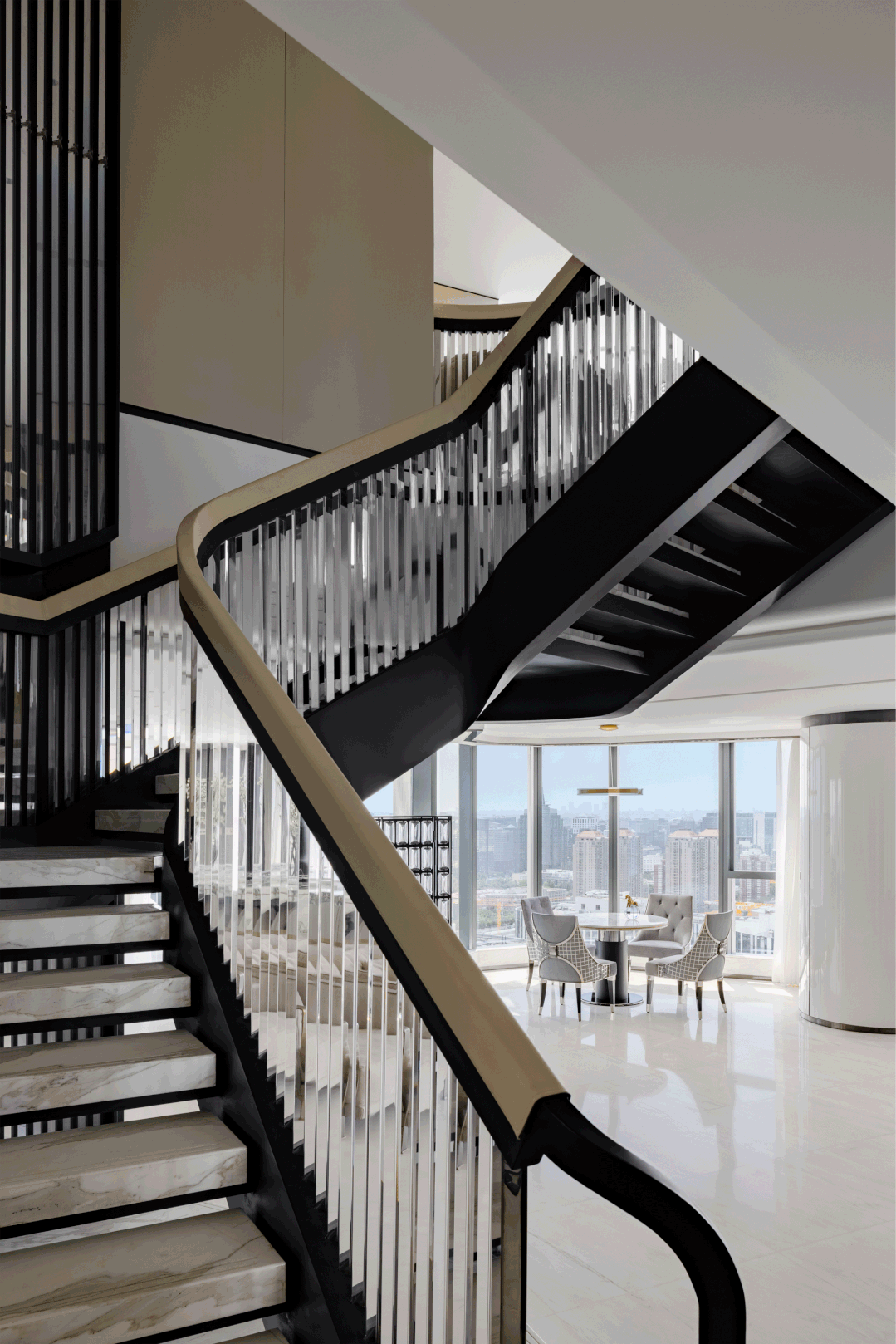 流線型線條,純粹的空間結構和在細節上的考究,仿車尾落地燈的線條立面連至天花板,家具的每一處動線皆是首尾呼應,空間中處處是對流線的著墨講究。環線挑空客廳的天花板結構,車窗線條般流暢的落地燈,將客廳化車艙的無限延伸,而空間的支撐結構與落地燈一同勾勒出車窗外的城市風景。