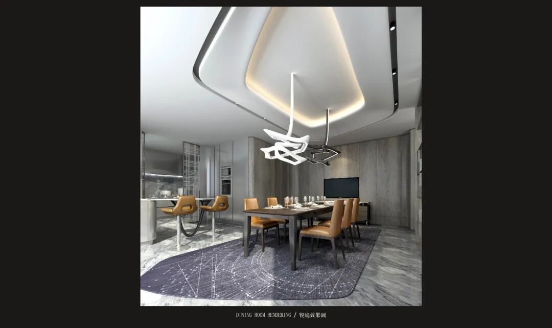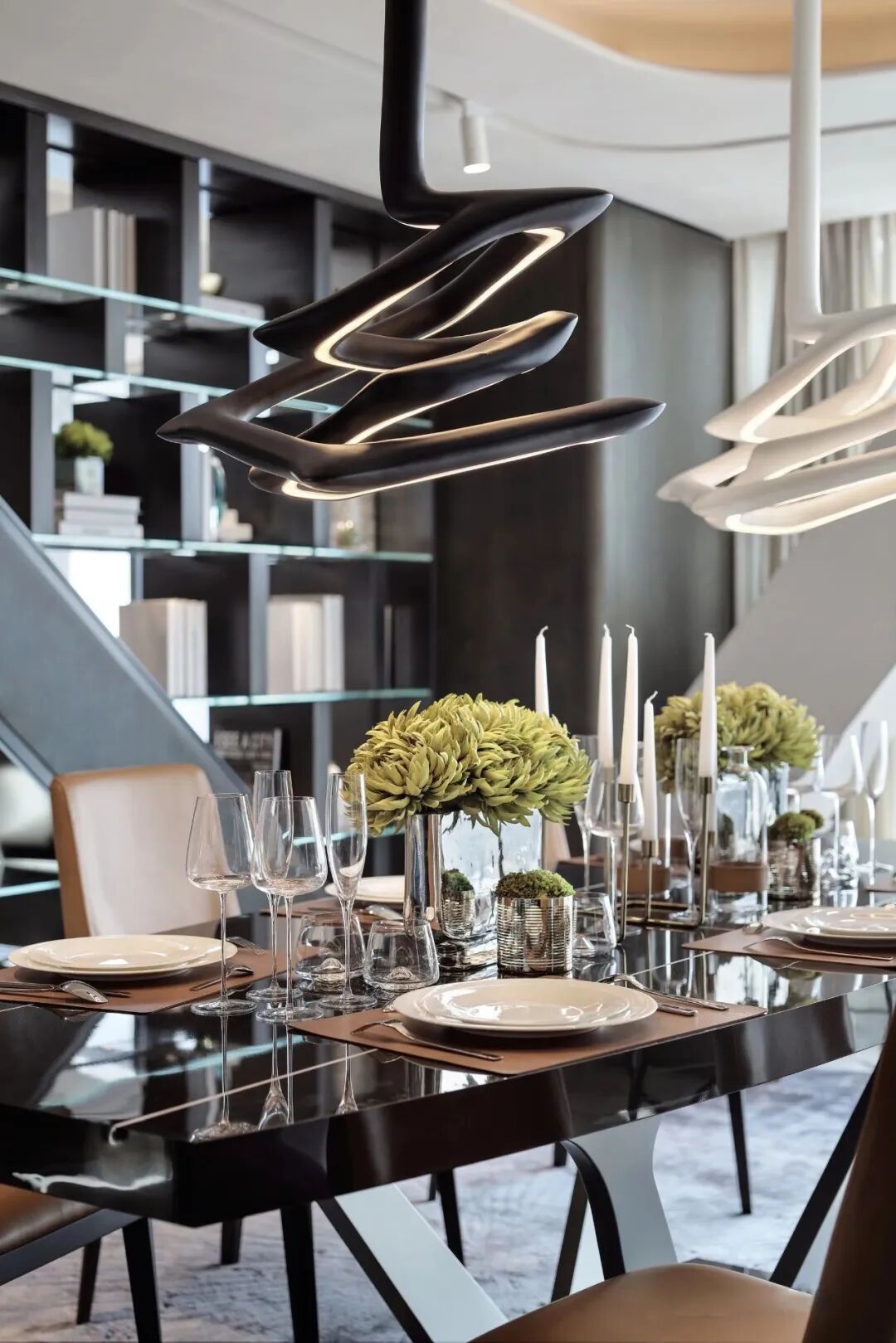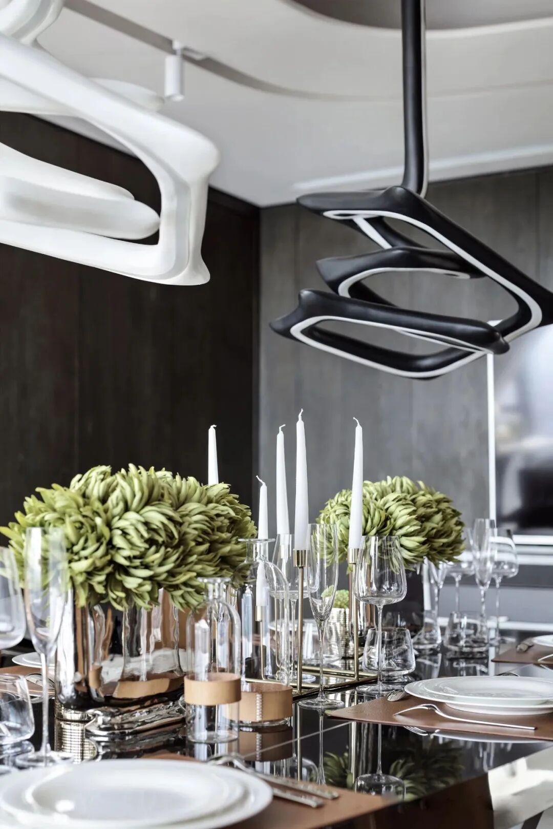 黑與白的碰撞,以一種難以調和卻又達到極致之後相互融合的特殊存在。黑白成為餐廳的主色調,線條旋繞的燈具勾勒超跑的賽道,頓折之間凝結力量之美。