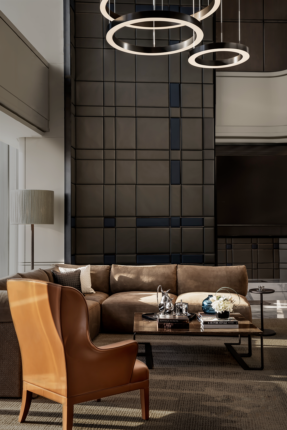 客廳的沙發柔軟而慵懶,由豐滿的靠墊製成。Tassello模塊化座椅由絨面革和粒面皮革製成,硬朗而不失格調。沉稳内敛的深色皮革家具,低调雅致气质不凡。经典编织工艺,超越了时间和空间的界限,不随波逐流,不追求浮夸矫饰,不被外界所左右,打造家居艺术不可逾越的奢华经典。