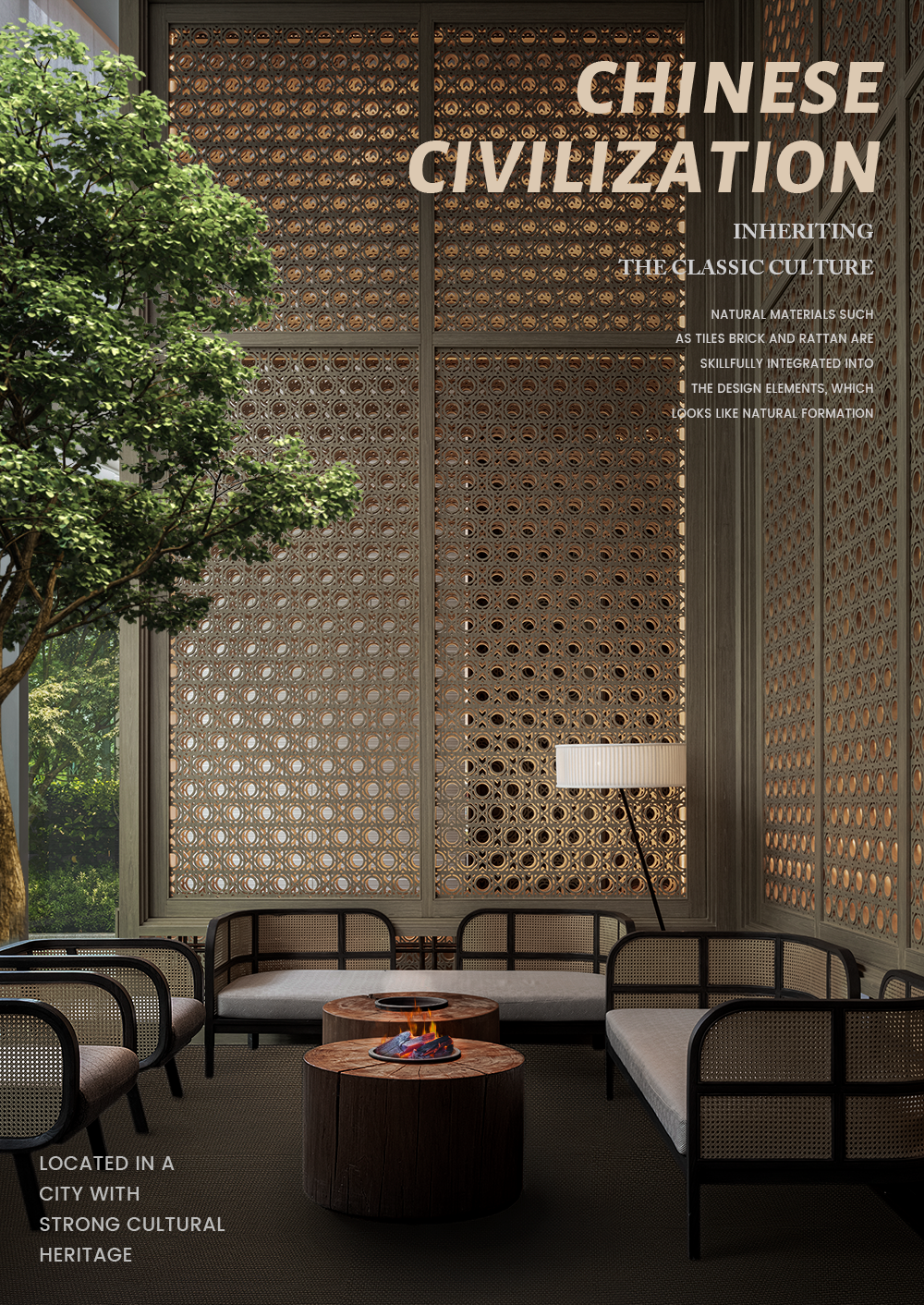 大堂區,我們採用巴蜀傳統藤編工藝,將藤編的結構美與立面感糅合在空間之中。