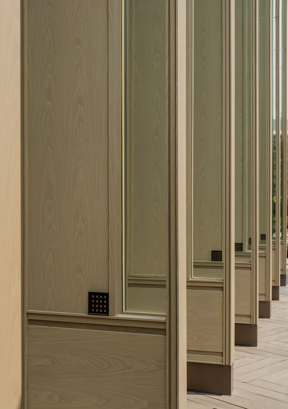 大自然的純樸木色結合灰色洞石構建起空間的序列感。