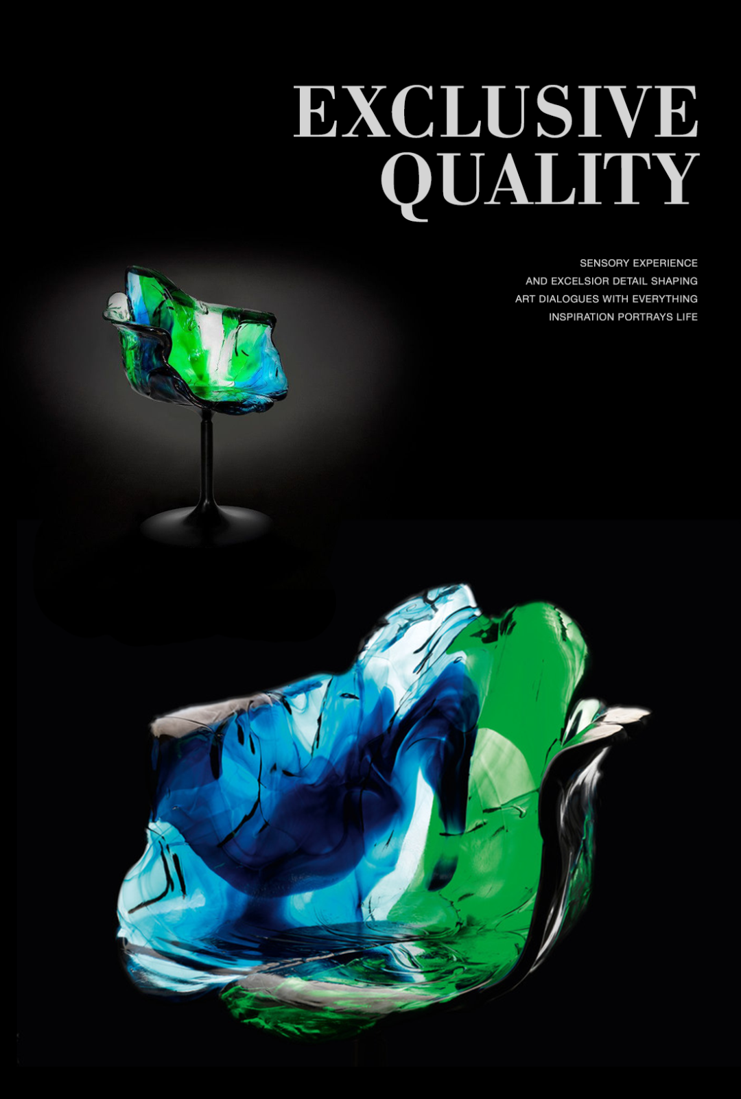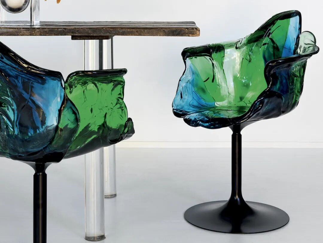 采用聚碳酸酯手工製成,Jacopo Foggini系列椅子每件都是獨一無二的,优雅而独特。透明和柔和色調的花瓣混合綠色和藍色,讓人想起花朵的形狀,增加靈性和一抹生機。