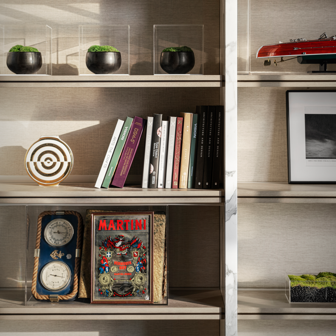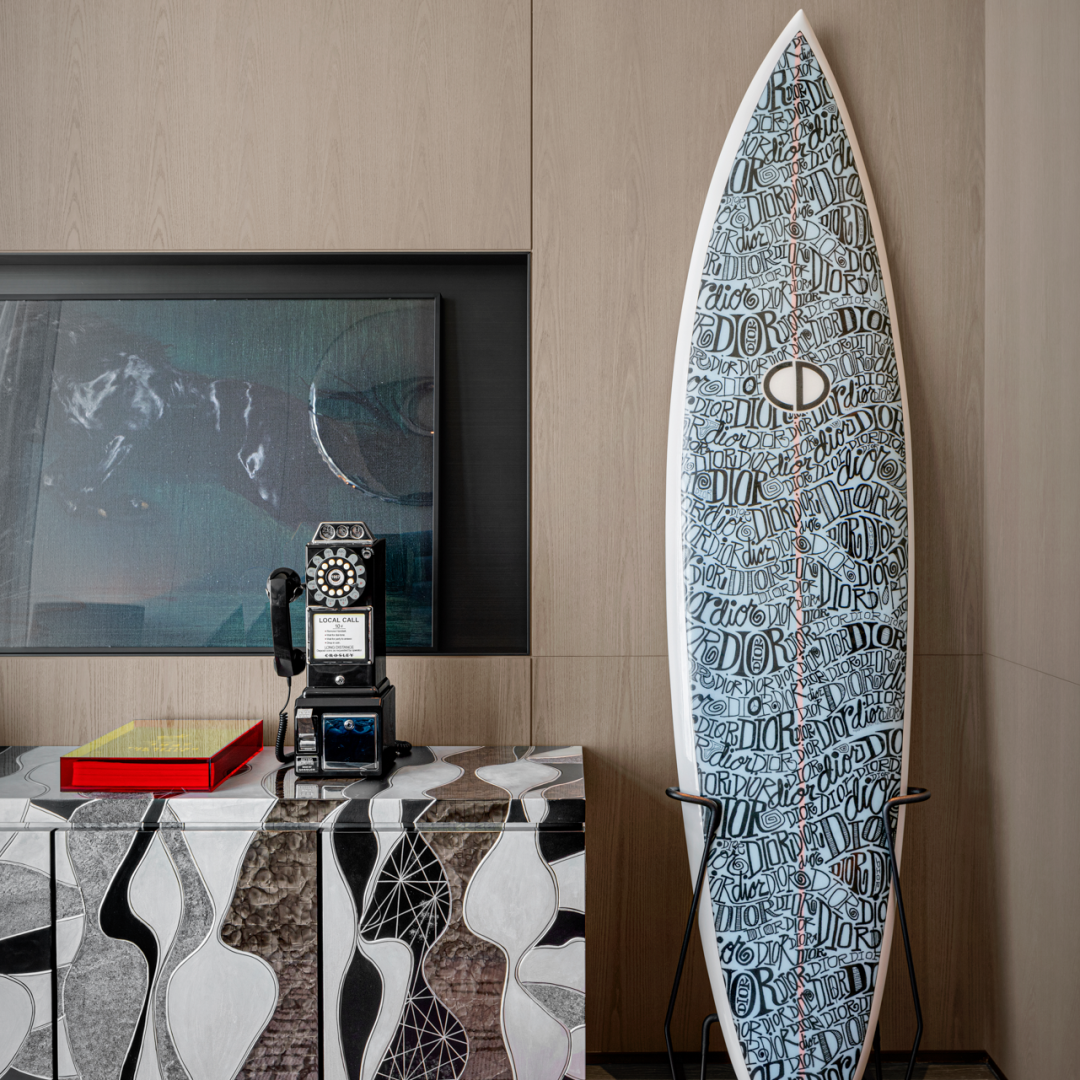 延續着整個空間“大膽且具玩味”的設計理唸,並結合房主多樣的興趣愛好,不同的古董物件藏品,以及海上戶外用具以藝術的方式陳列於此。