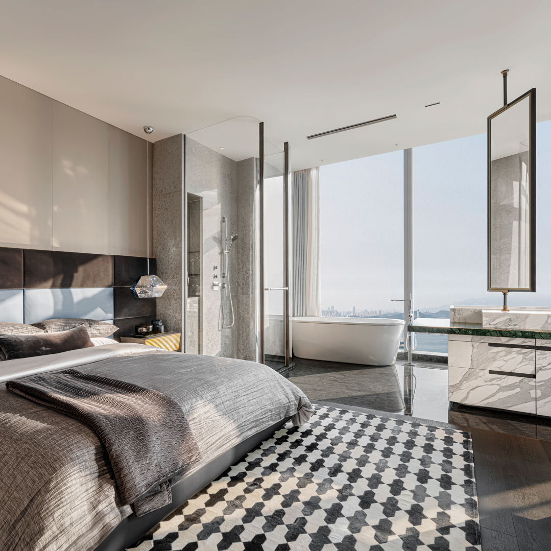作爲私密的個人空間,空間的氛圍與公共空間相比更加沉穩舒適和低調的奢華。