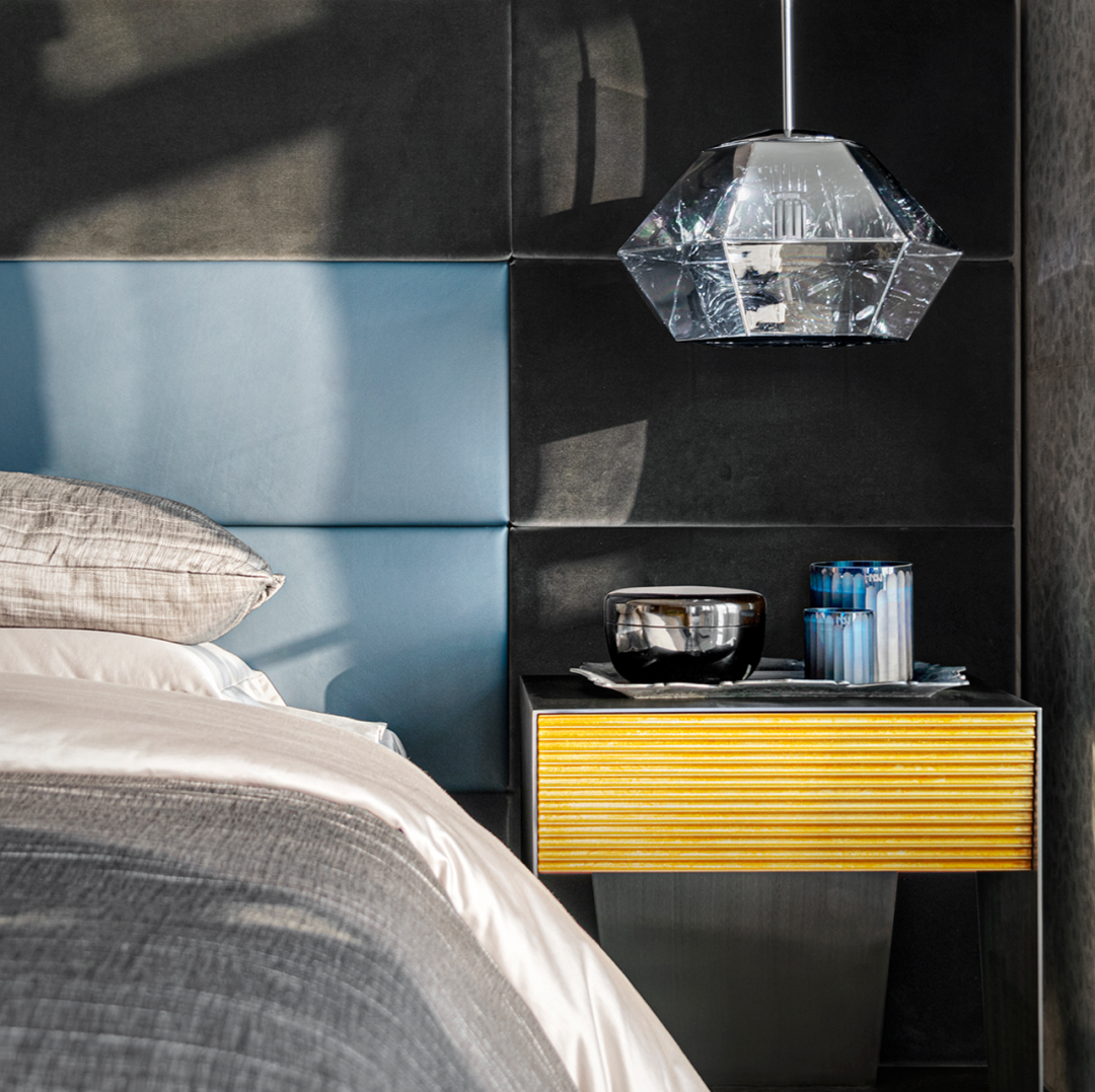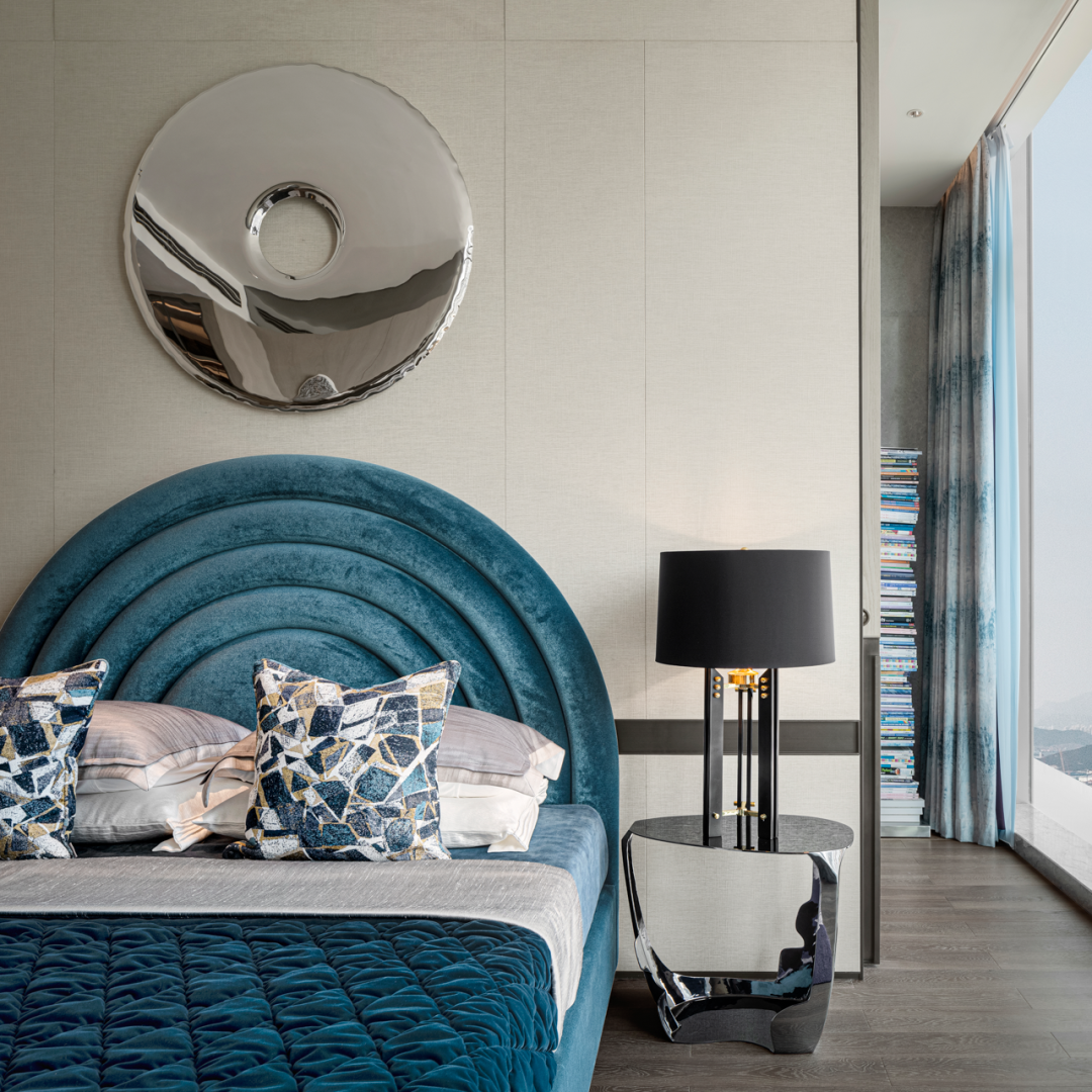考慮到更舒適的睡眠體驗,床品選擇了來自意大利的品牌POLIFOM。背靠大床屏,設計師在材質上也選擇了兩種不同的皮料進行拼貼,以深藍色爲主帶來靜謐而舒適的感受。
