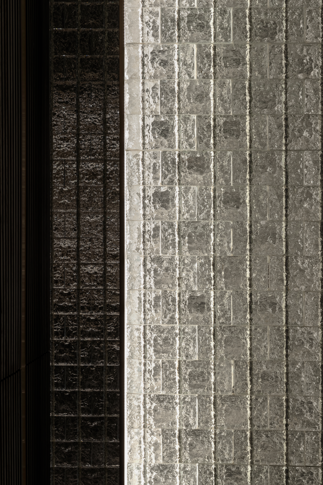 亮丽的玻璃砖墙作为调色,和植物呼应,给空间注入活力,同时又有一种古轻奢的内敛。