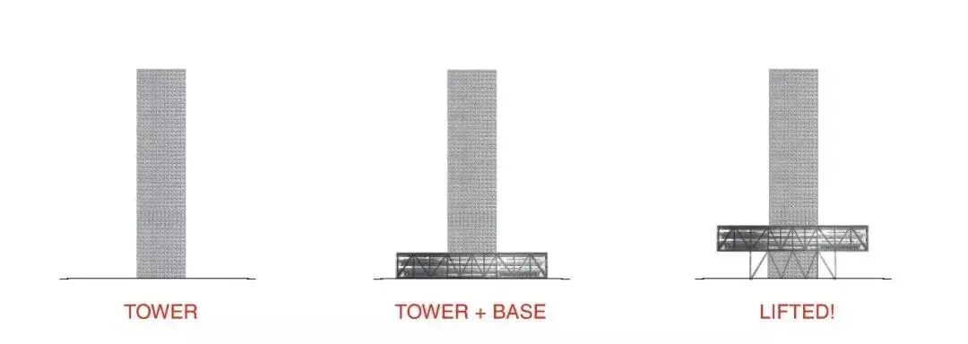 从图上可以看到,设计的原型来自一栋无异于任何办公大楼的通用形式,但库哈斯增加了基座并抬升,就为城市人群提供了一个可休憩、聊天的公共场所,为人群活动提供空间。