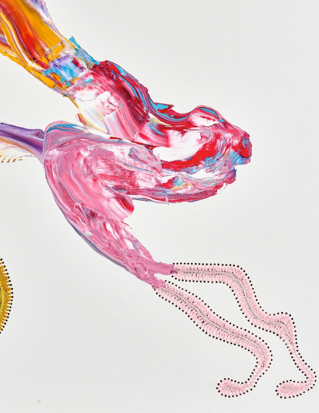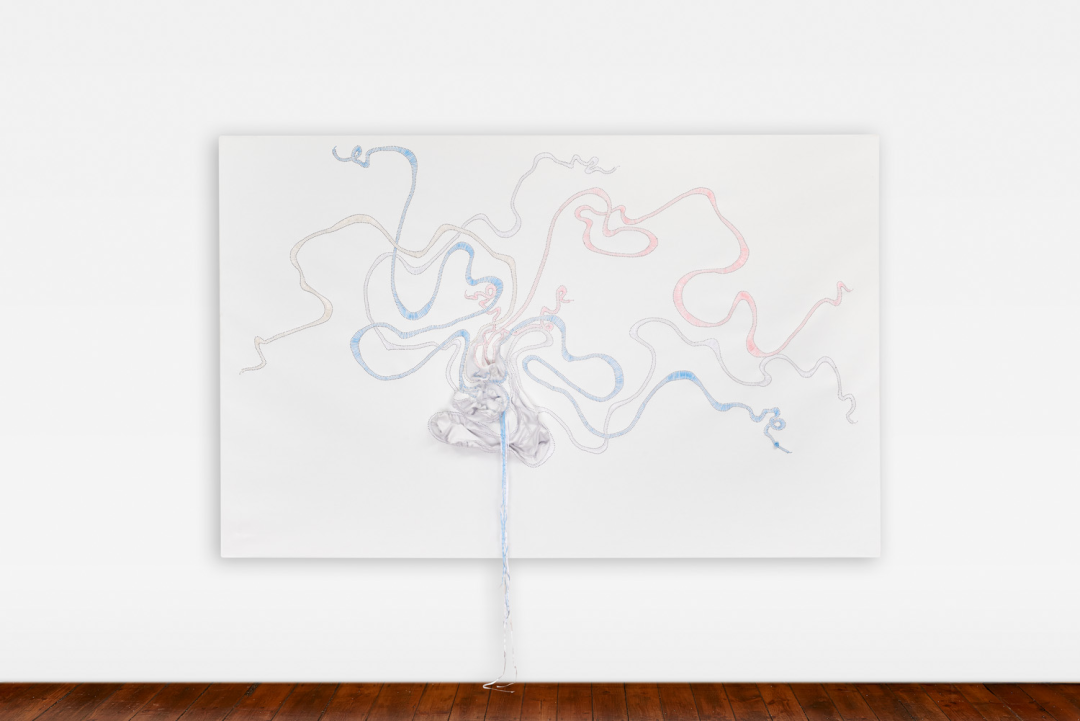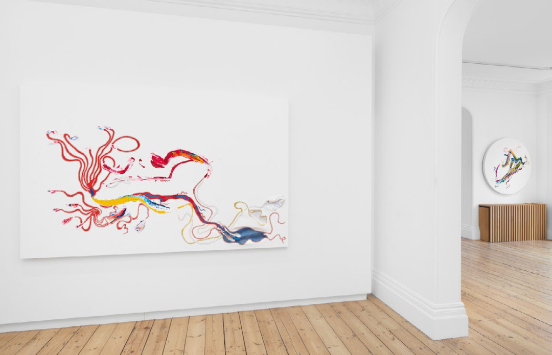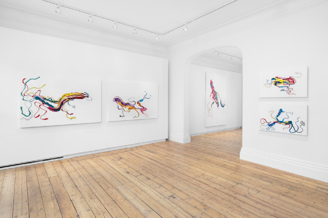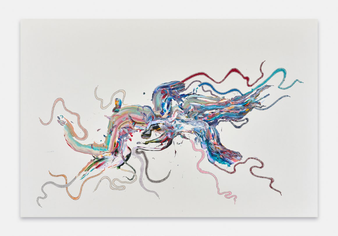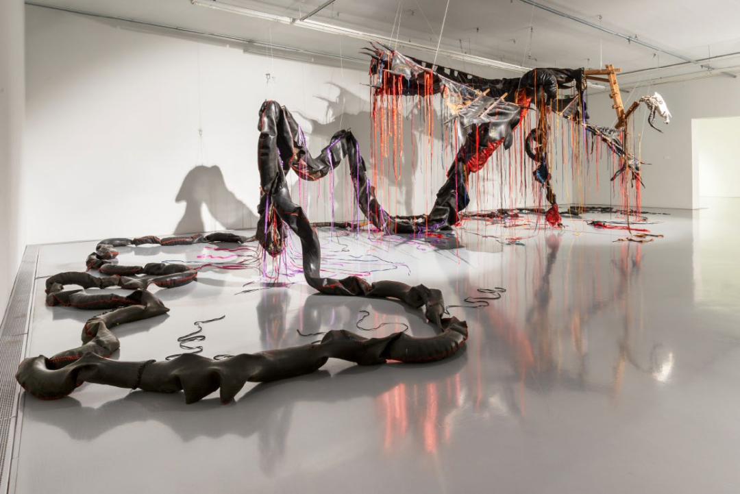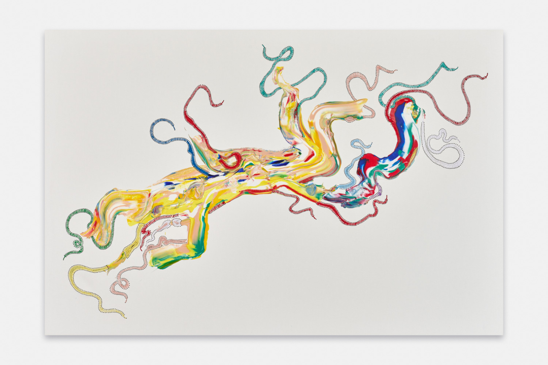 2020年初的疫情让贺罗伯被迫在很长一段时间内独自在工作室创作。现实中的灰暗与死亡让他重新开始在绘画装置中使用彩色丙烯颜料。2022年初,在立木画廊(伦敦)的个展lizeni lenkanyiso(大意为“启蒙浪潮”)中,艺术家从海龟、蜥蜴、蛇等“冷血”生物中获得灵感,表达了大流行后人们“寻找快乐或温暖”的需要。在这些抽象图形中,我们仍然看到艺术家那些为人熟知的手法,色彩艳丽的丝带被缝制在事先裁剪的画布上,如同温暖洋流一般的丙烯颜料未经调色板调和,直接被泼洒在画面上,但仍然保持了颜色各自的纯度,一如艺术家一贯的“缝合”意象,产生流动的视觉形态和不确定的精神内涵。在即将到来的第九届西岸艺术与设计博览会上,立木画廊将为大家带来贺罗伯在国内的首次特别个展项目,正如画廊总监Tiffany Xu/许冉冉所说,“艺术家通过丙烯、皮革、橡胶和丝带描绘出半拟人化的形态,将长久以来带有性别偏见的绘画实践(历史上一直由‘男性艺术天才’主导)与工艺实践(常被贬入家用的、‘女性化’的领域)相融合来进行创作,让人感到熟悉、陌生而又古老。”涌动的色彩既是艺术家对自身创作的迭代,同时也是对新的语境中自我身份的重新确立。那些不可名状的形态,是河流、脐带与触角,语言、神经网络与梦境,艺术家试图将事物间的裂隙缝合,以此编织出唐娜·哈拉维 (Donna Haraway) 所谓的“多元的生命存在形式”中的一种:突破诸多二元对立的“我”的形态。