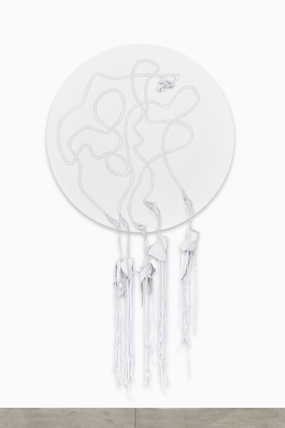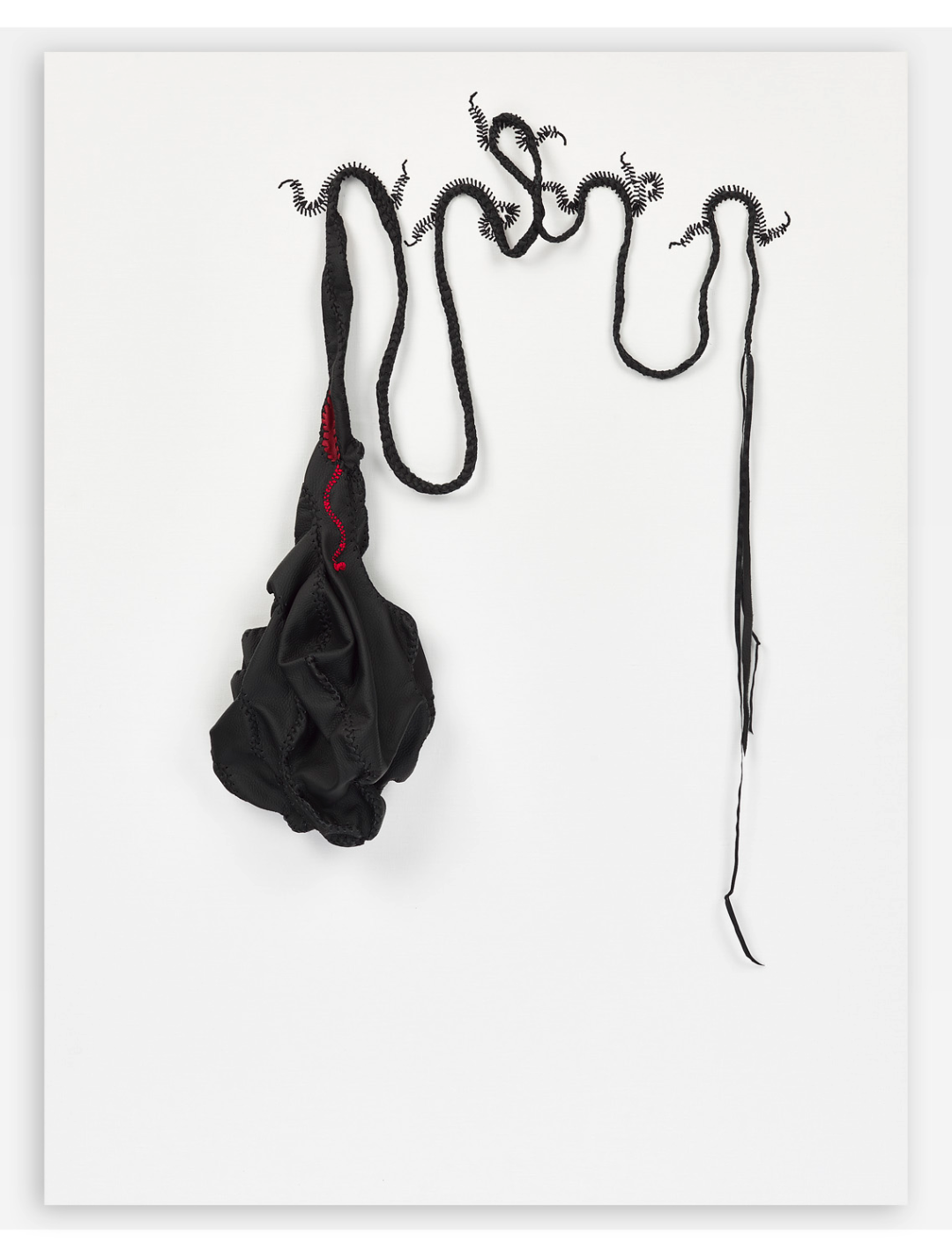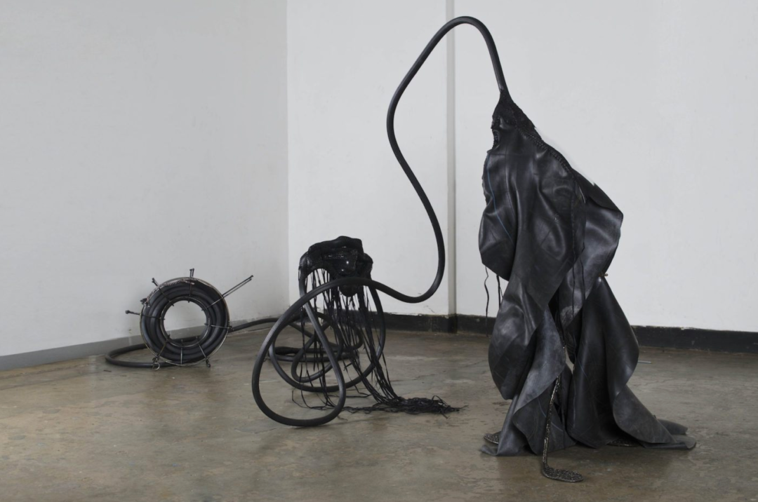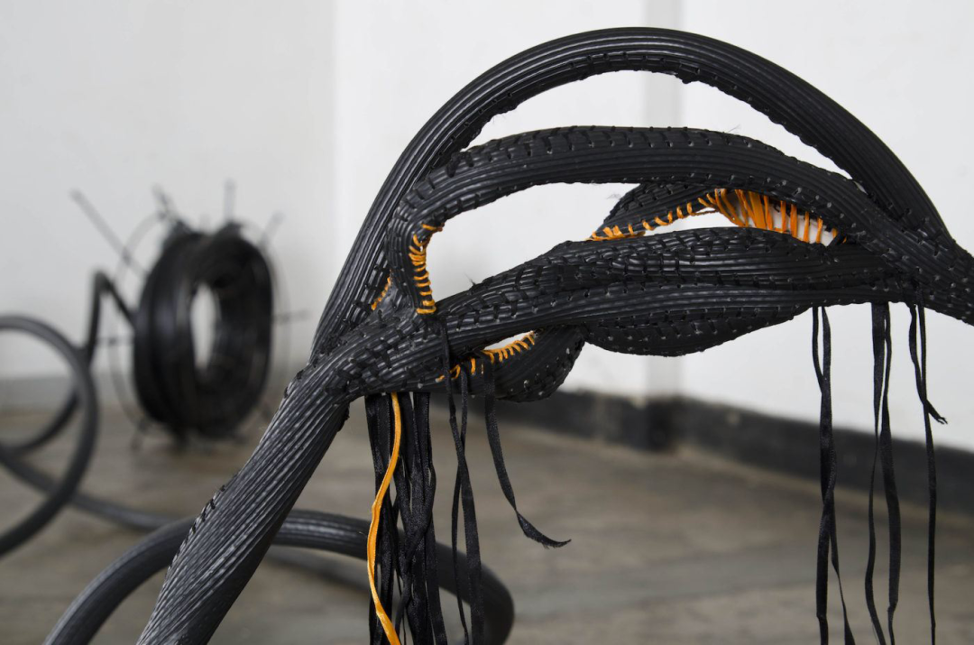 受到早年参观阿姆斯特丹性博物馆经历的启发,艺术家开始在雕塑与绘画作品中缝合橡胶轮胎、皮革、丝带、纱布等材料,这也成了他最具有代表性的语言。Balindile I (2012) 中,艺术家从约翰内斯堡的修车厂搜集废弃橡胶汽车轮胎,它们象征了南非男性权贵的财富,而橡胶材质还与避孕套的生产有关,传递了一种暧昧的男性气概。在这件作品中,艺术家使用象征着女性气质的缝纫工艺将丝带缝制在形态不明的橡胶身体上,令后者处在不断的崩解与坍塌之中。“缝合”象征了一种去中心化的差异性统一,它消弭了“男—女”、“白人—有色人种”以及“艺术—手艺”之间的界限,但同时也提示了“缝合”前的伤痛经验。哈尔·福斯特 (Hal Foster) 曾经在论及伊娃·海瑟 (Eva Hrsse) 时总结了序列性作品的“二律背反” (antinomy) 。将这个说法用在贺罗伯的作品中,即是:织针的序列在弥合差异的同时,也在同时描述穿刺的极端性及其背后的暴力和极权。因此,我们似乎可以在艺术家的作品中看到一丝萨德式的疯狂,它是艺术家对自身欲望的独白。于是,“缝合”就成了一种在生死冲动之间来回拉扯的动作。