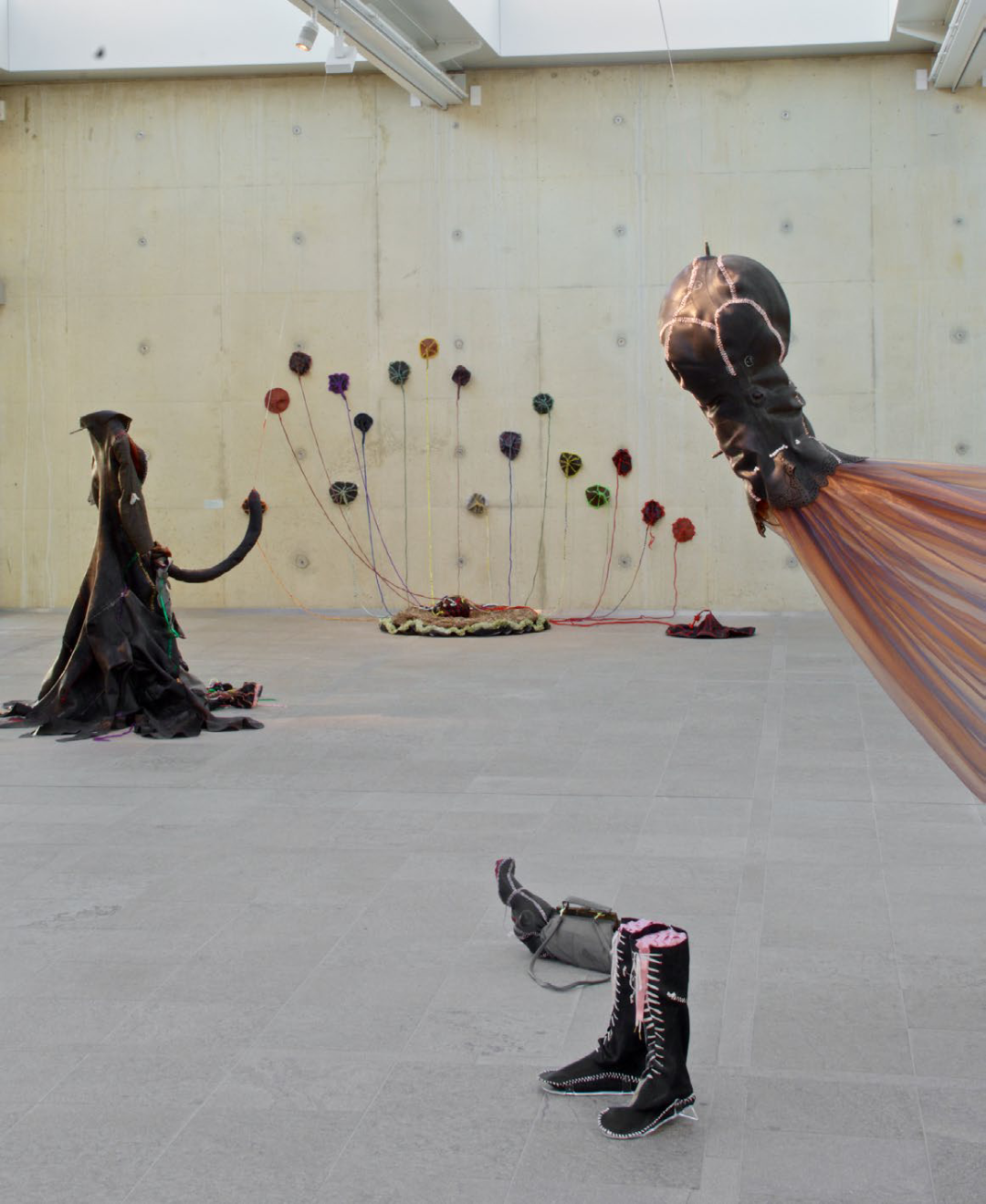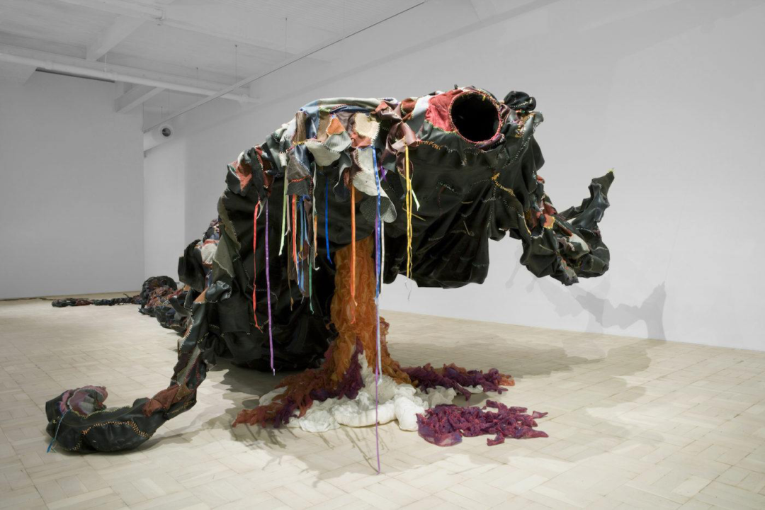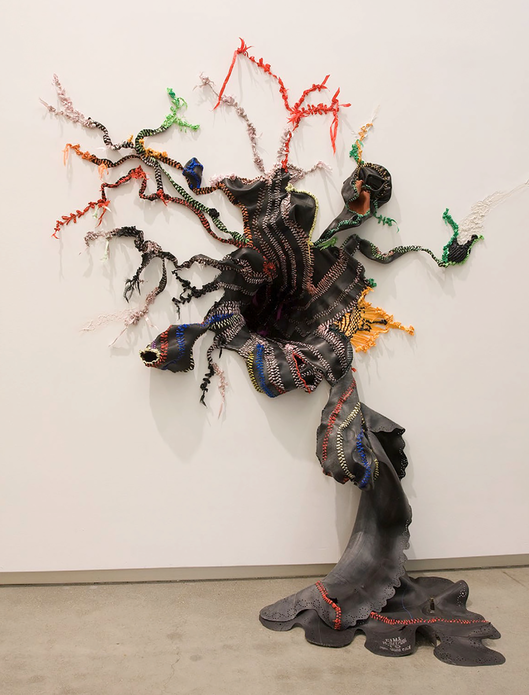 受到早年参观阿姆斯特丹性博物馆经历的启发,艺术家开始在雕塑与绘画作品中缝合橡胶轮胎、皮革、丝带、纱布等材料,这也成了他最具有代表性的语言。Balindile I (2012) 中,艺术家从约翰内斯堡的修车厂搜集废弃橡胶汽车轮胎,它们象征了南非男性权贵的财富,而橡胶材质还与避孕套的生产有关,传递了一种暧昧的男性气概。在这件作品中,艺术家使用象征着女性气质的缝纫工艺将丝带缝制在形态不明的橡胶身体上,令后者处在不断的崩解与坍塌之中。“缝合”象征了一种去中心化的差异性统一,它消弭了“男—女”、“白人—有色人种”以及“艺术—手艺”之间的界限,但同时也提示了“缝合”前的伤痛经验。哈尔·福斯特 (Hal Foster) 曾经在论及伊娃·海瑟 (Eva Hrsse) 时总结了序列性作品的“二律背反” (antinomy) 。将这个说法用在贺罗伯的作品中,即是:织针的序列在弥合差异的同时,也在同时描述穿刺的极端性及其背后的暴力和极权。因此,我们似乎可以在艺术家的作品中看到一丝萨德式的疯狂,它是艺术家对自身欲望的独白。于是,“缝合”就成了一种在生死冲动之间来回拉扯的动作。