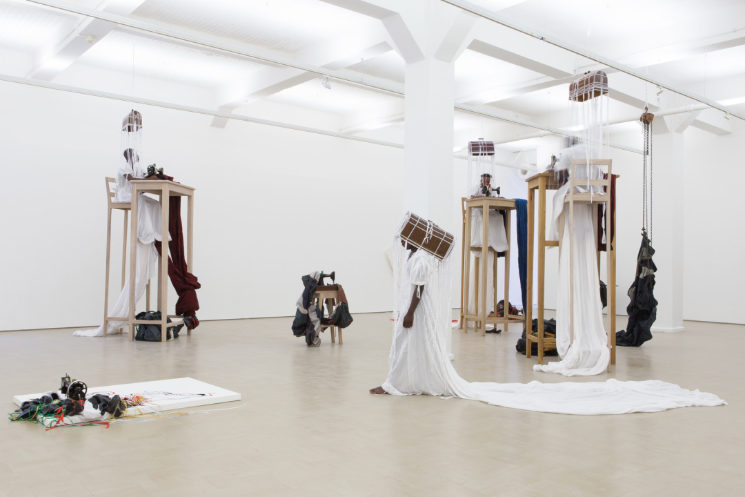 织布与缝纫是否塑造并框定了女性的部分性别意识?对于曾经经历漫长“男耕女织”历史以及计划经济时代以拥有“老三件”为傲的中国人来说,答案是不言而喻的。在哲学家萨迪·普兰 (Sadie Plant) 看来,自从有了踏板和梭子,织布机就成了“最复杂的人力引擎”。织工被整合到机器中,四肢动作与机器的工序相连。在传统的科萨族社会,女性被要求在家耕种与织布,在此过程中,科萨族女性创造了其民族服饰中的众多复杂工艺。贺罗伯在此间发现了缝纫的力量,将其视为消解男性气概与女性气质之间差异的武器。他将缝纫中针尖和孔眼的交替运动视为两性生殖器不断咬合的过程。在2016至2017年的展览SEWING SAW的现场中,表演者坐在观众无法触及的高脚桌椅上使用老式缝纫机进行制衣,艺术家认为集体编织的动作中交织着织造者不同的灵魂,最后就能汇集、重构成一幅关于南非人的“非洲未来主义” (Afrofuturism) 图景。