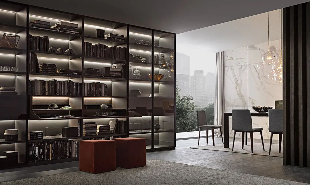 像这种定制高端家具,从正面看几乎是一条线光,看不出厚度,实际是前窄后宽,在金属层板的后部稍宽可以安装超薄型定制的灯带,带来极佳的产品体验和视觉感受。