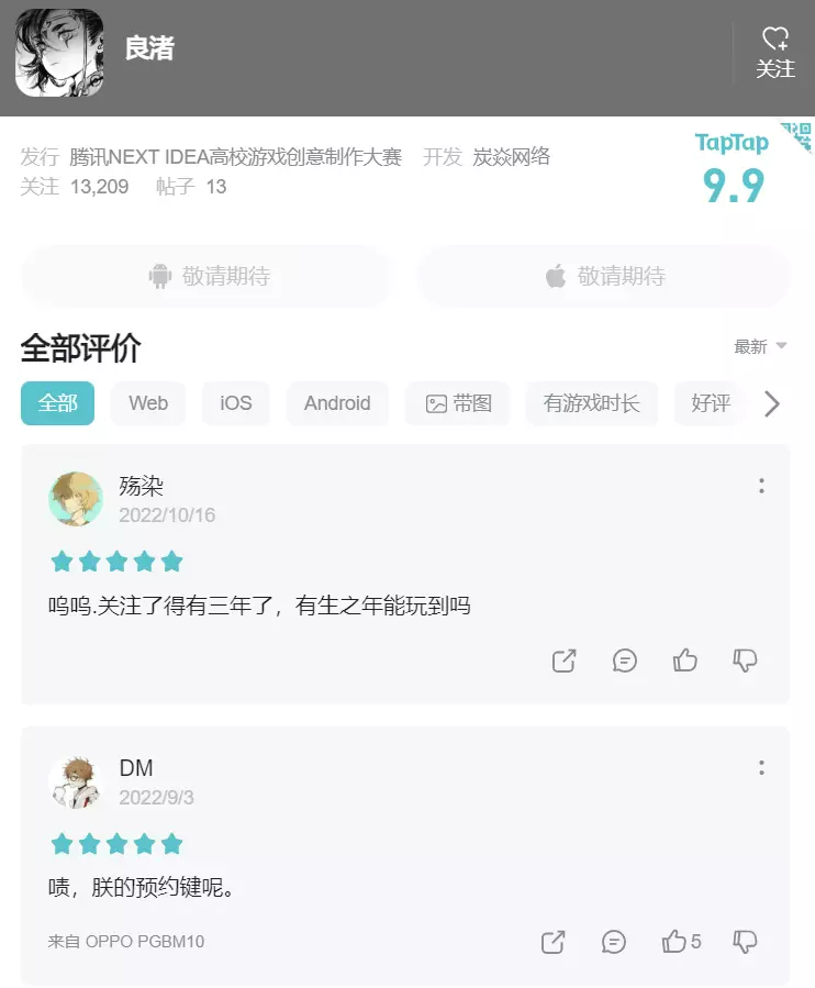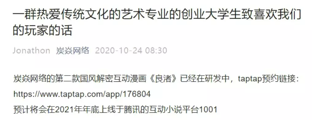 但之后,炭焱网络基本停止了公开信息的更新,没有再公布两款项目的研发进度——TapTap上的《良渚》,也从预约状态变成了「敬请期待」。