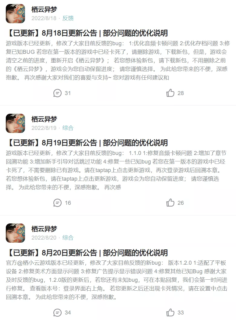 但由于《栖云异梦》目前只有4名开发人员,因此即使有着美术和文化题材上的支撑,产品上线初期也因玩法或优化上的BUG,评分一度下滑至8.6分,后来在听取玩家意见不断优化之后,评分才逐渐回升至8.8分。
