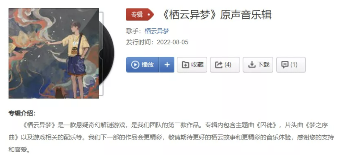 又比如炭焱网络的一位音乐制作人,分别为《栖云异梦》和《梦蝶》制作了音乐专辑,并在近期上架了相关音乐平台。