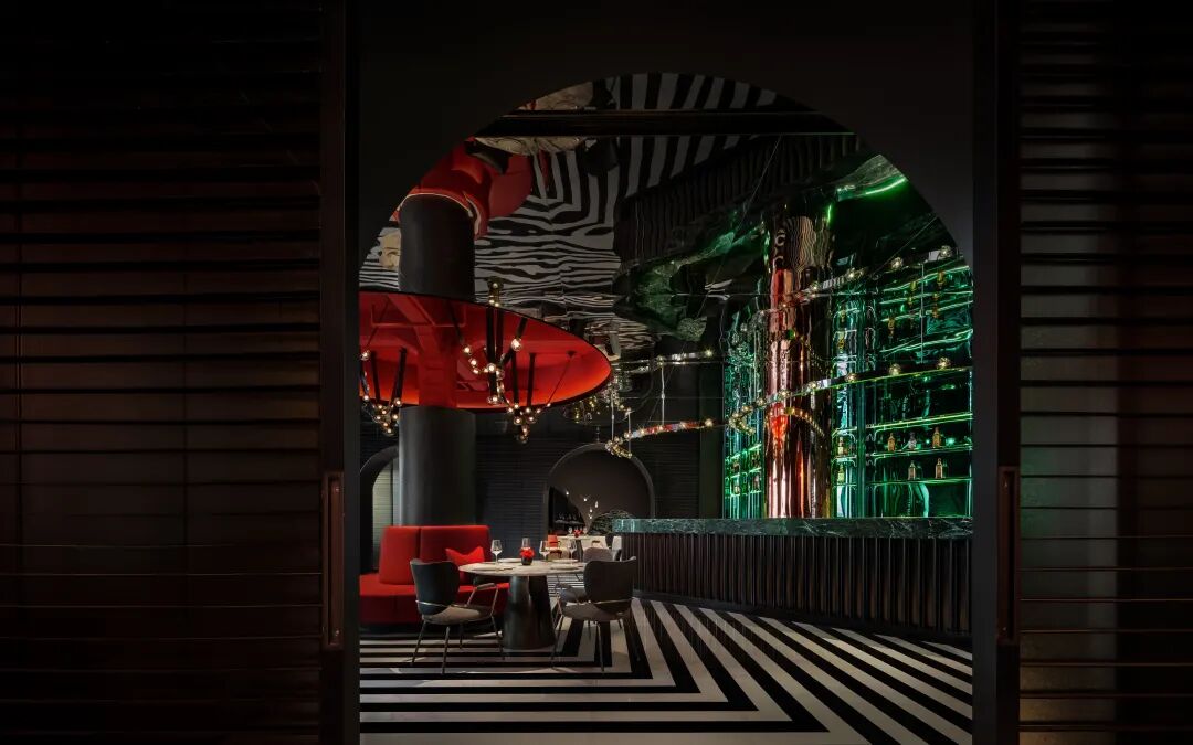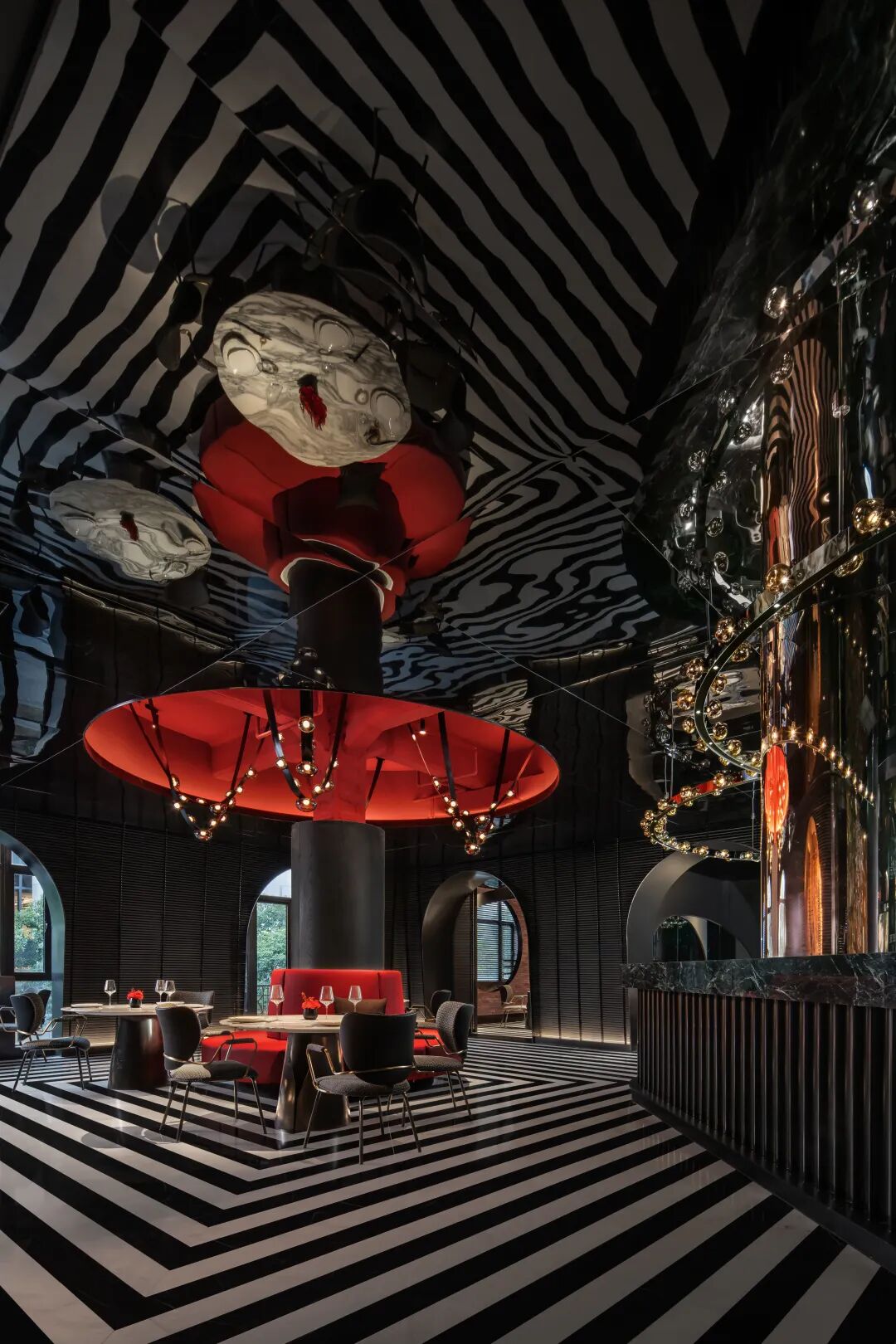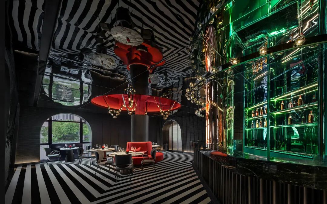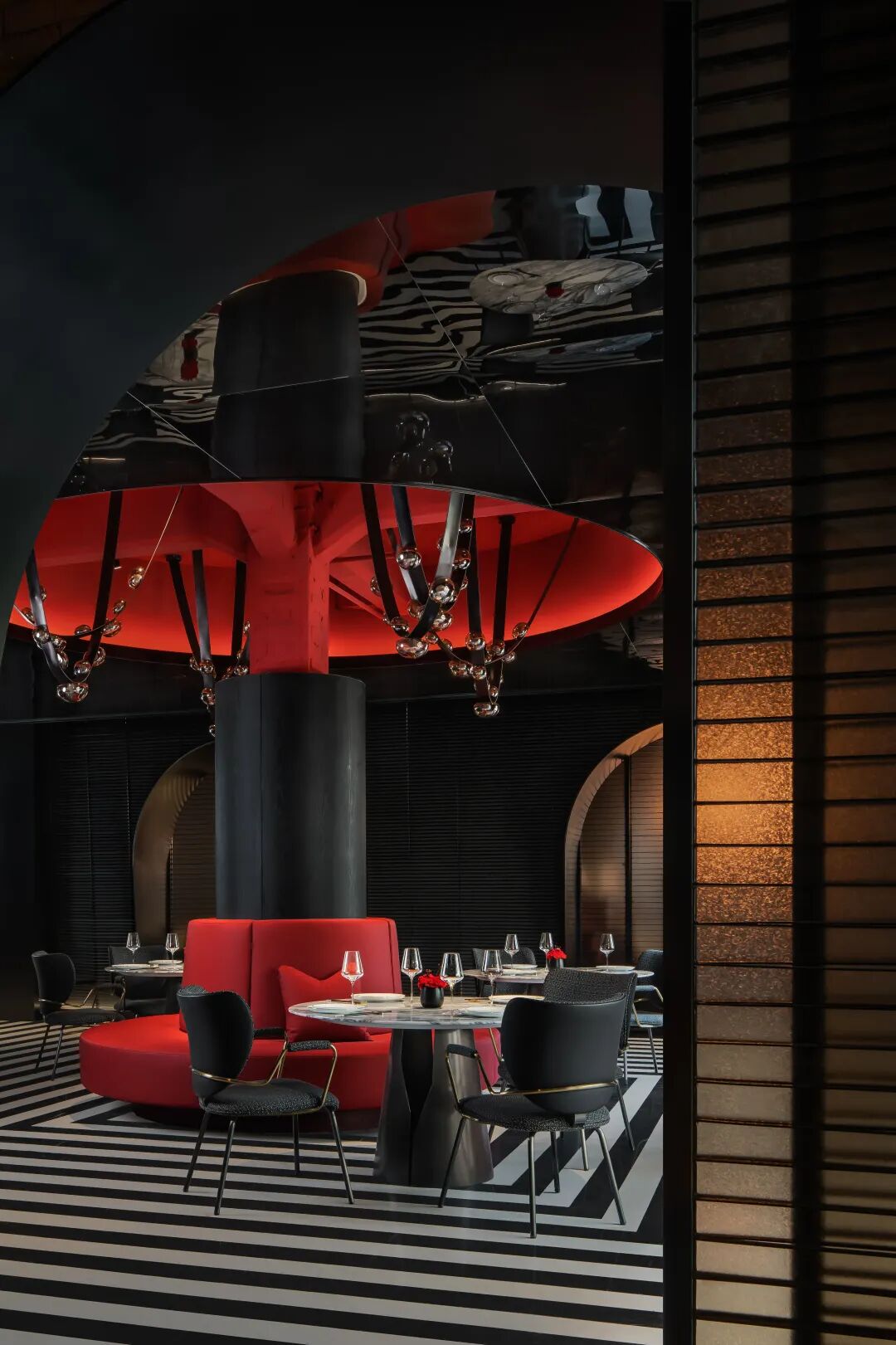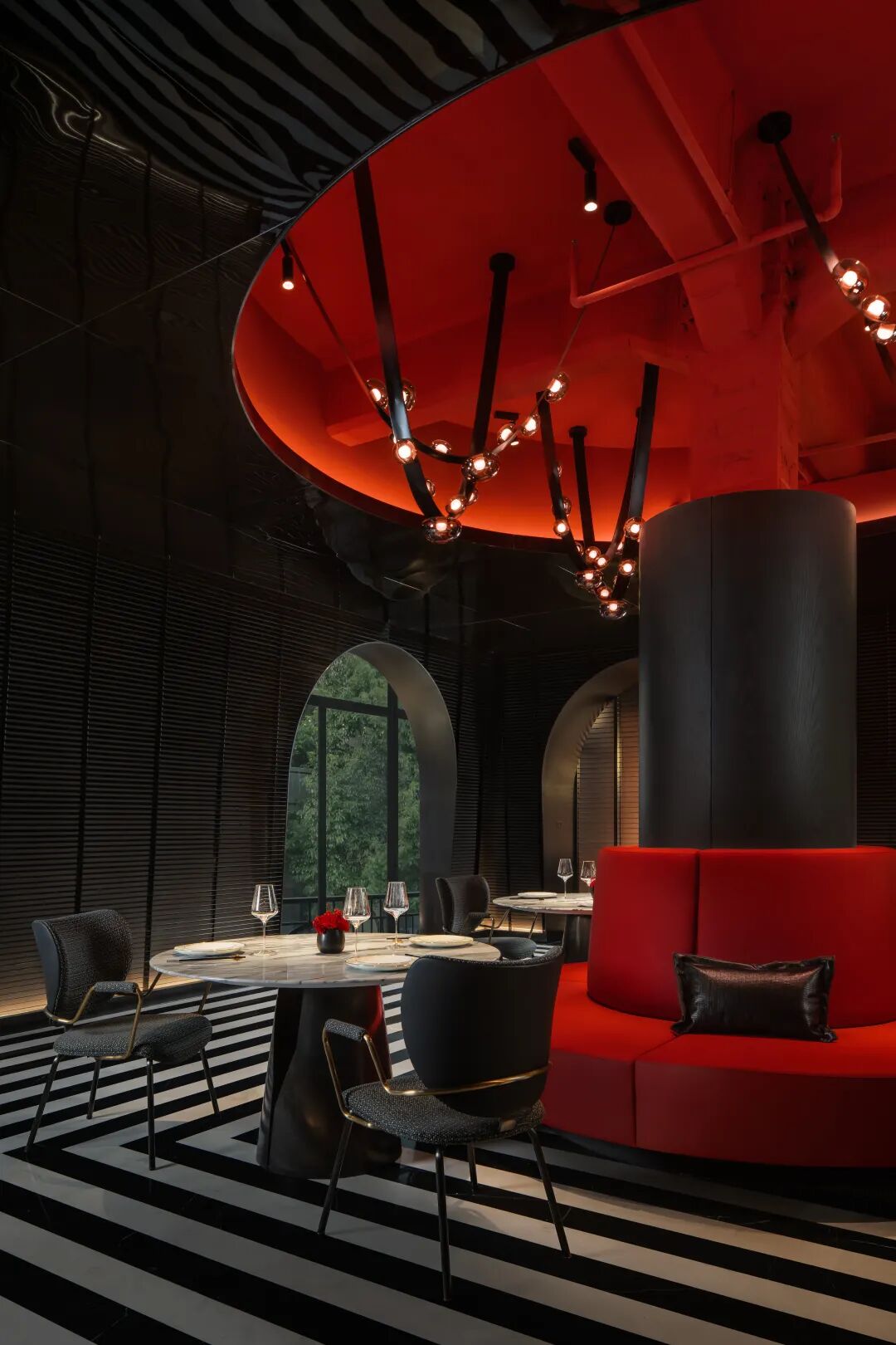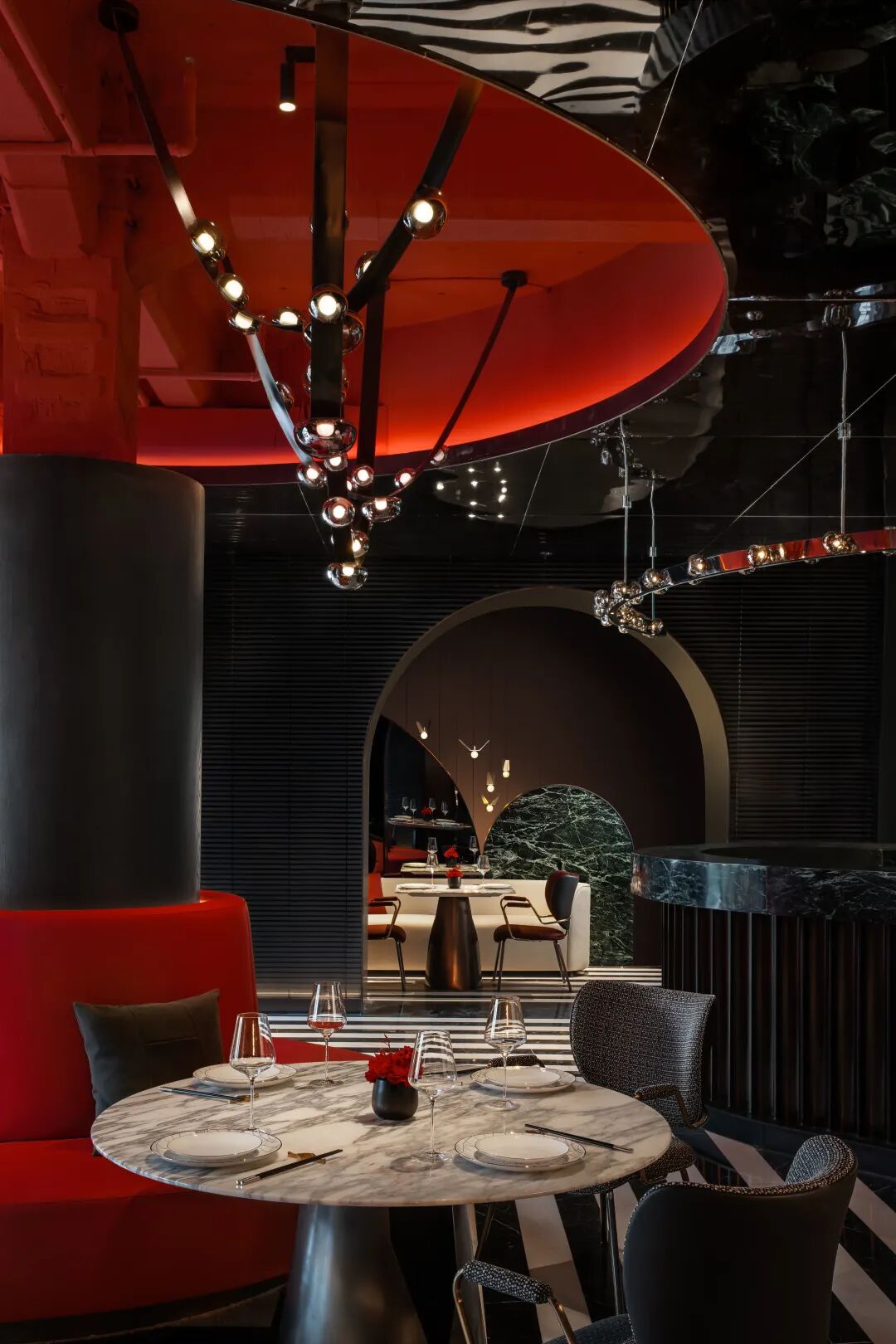 尤其是这座从来不缺异国风情元素餐厅的城市,曾建龙新旧共融,用色彩与材质制造惊喜。从入口步入大厅,具有色彩张力的黑色、红色与绿色,在高低错落的空间结构中交错纵横,仿佛构建了一个“第三空间”。