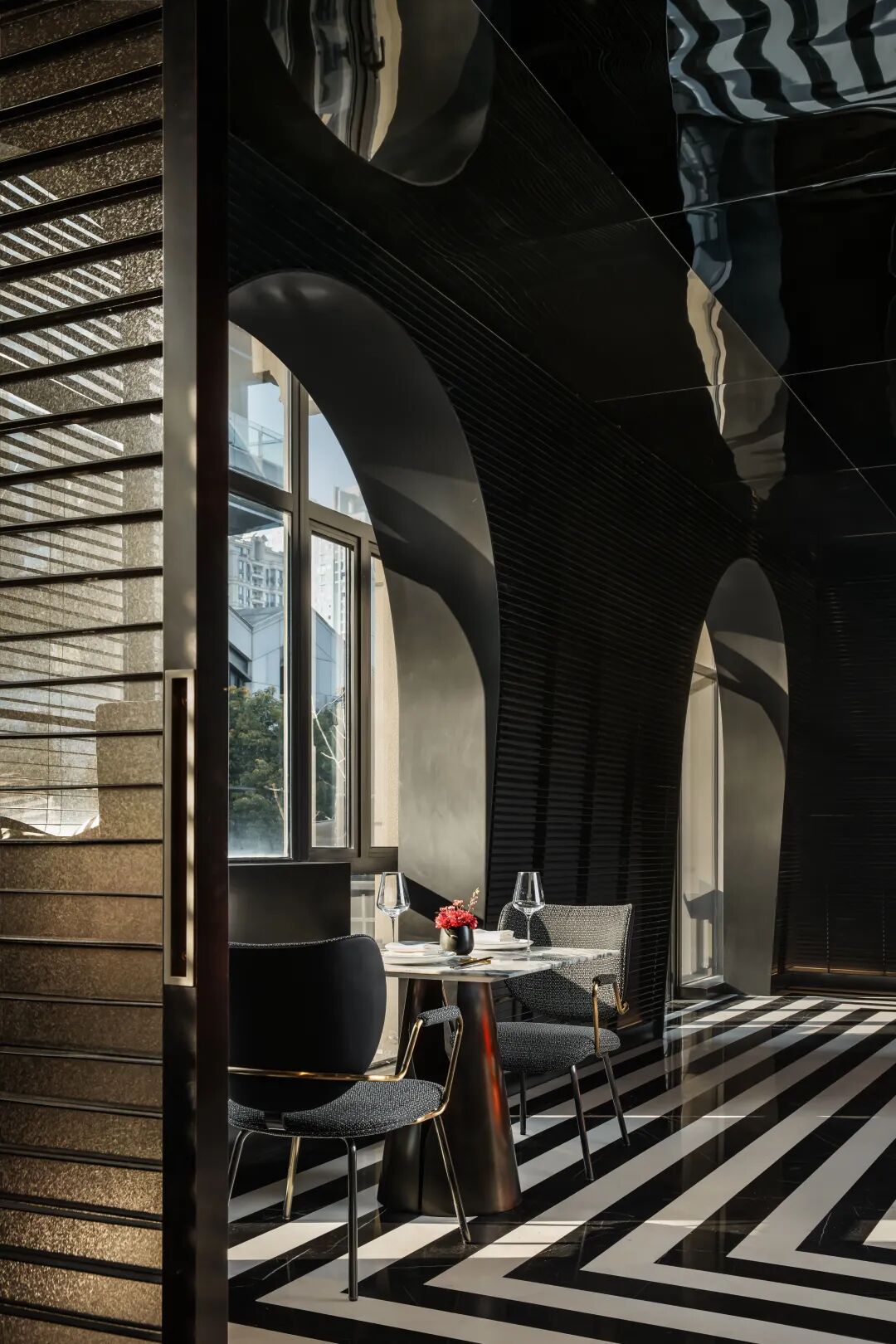 在跨时空对话基础上,廊道撑起了整体流动性。为了让餐厅动态更自然,立体式的几何构图划分了每个空间属性,使整个通道呈现多层次的逻辑关系。