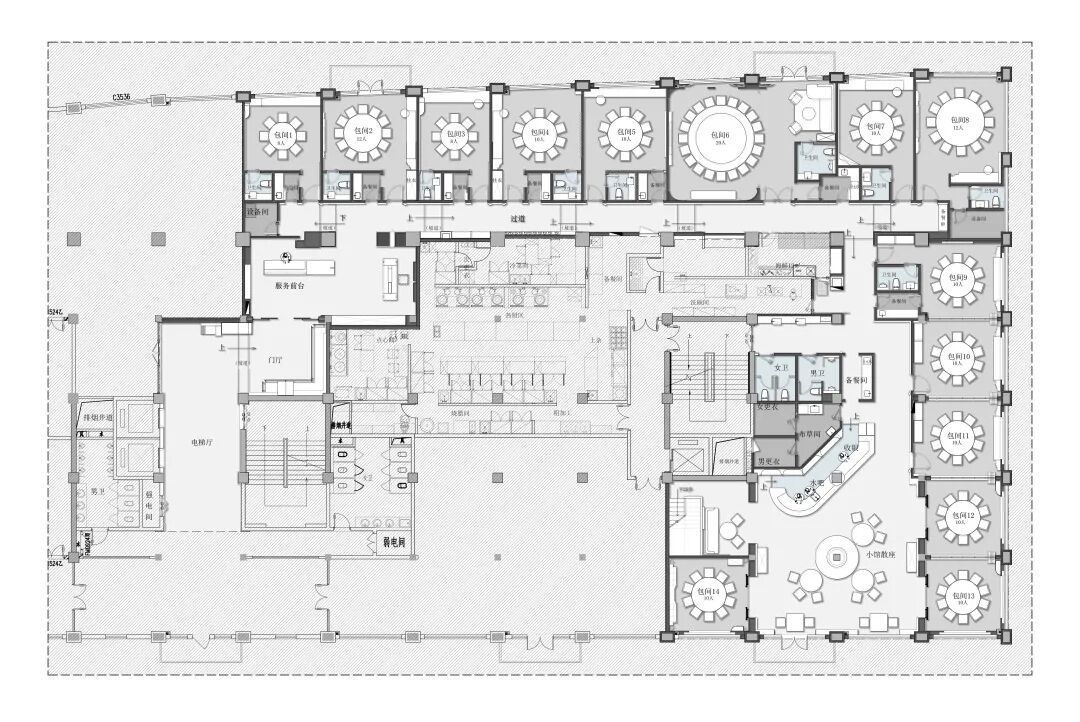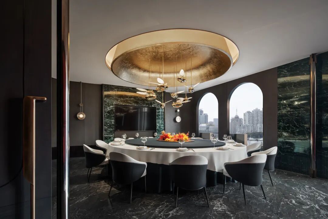 餐厅共有14间包厢,包括灵活的五连包和VIP包厢,分别位于大厅两侧。设计通过对江景的把握与用户体验的思考,大手笔将包厢一众划入看江的一面。