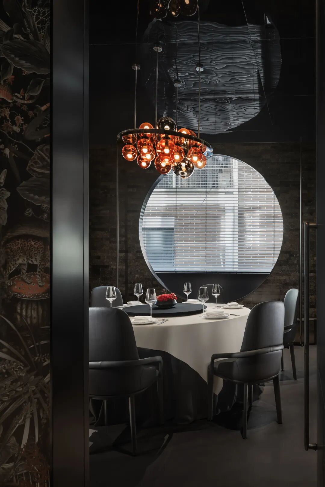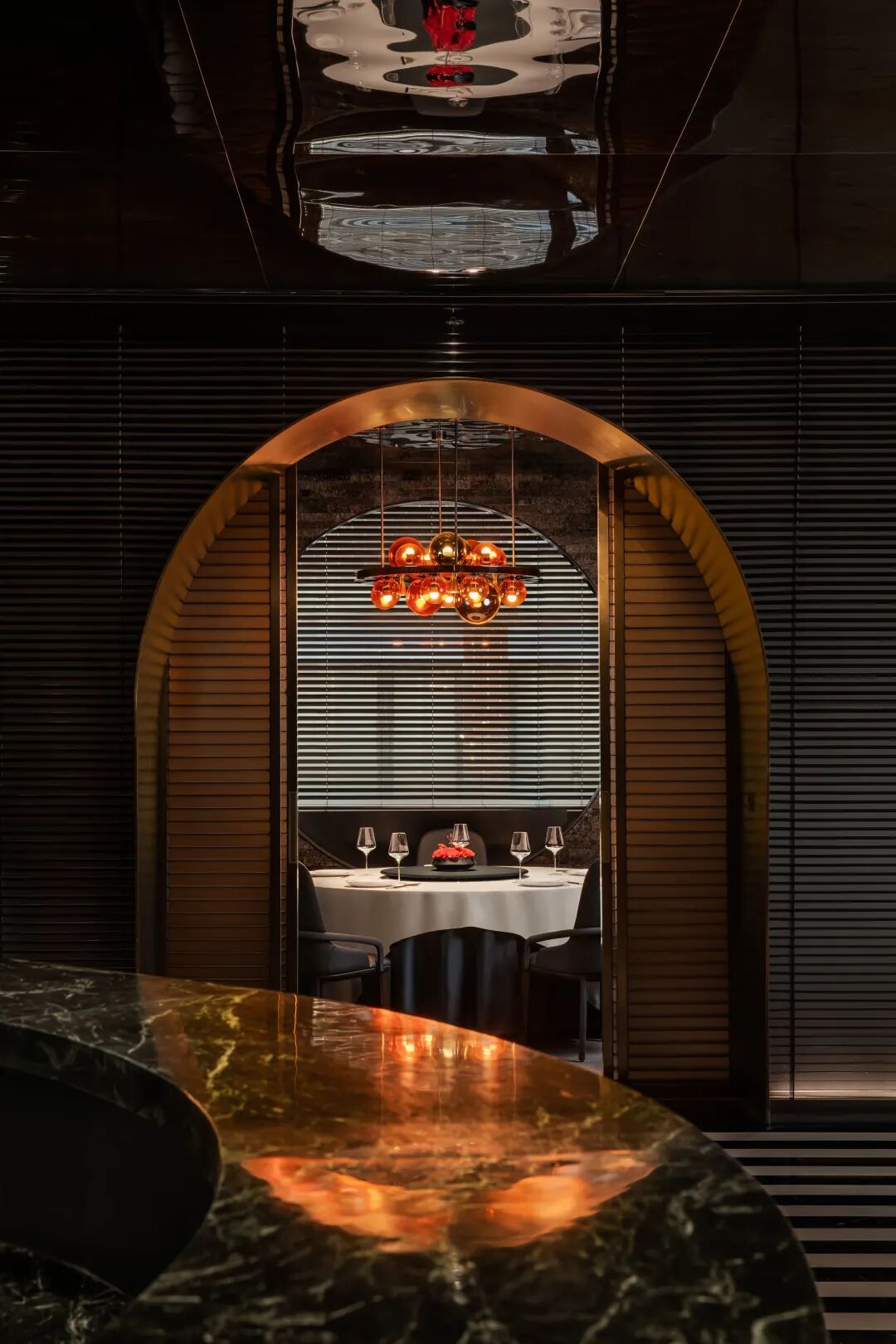 五连包的包房设计,统一融合大厅调性,以“圆”来收住建筑窗户的凌乱,令空间进入一种秩序感,同时呈现更好的仪式感。