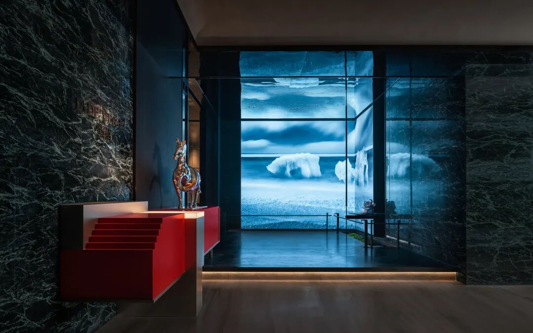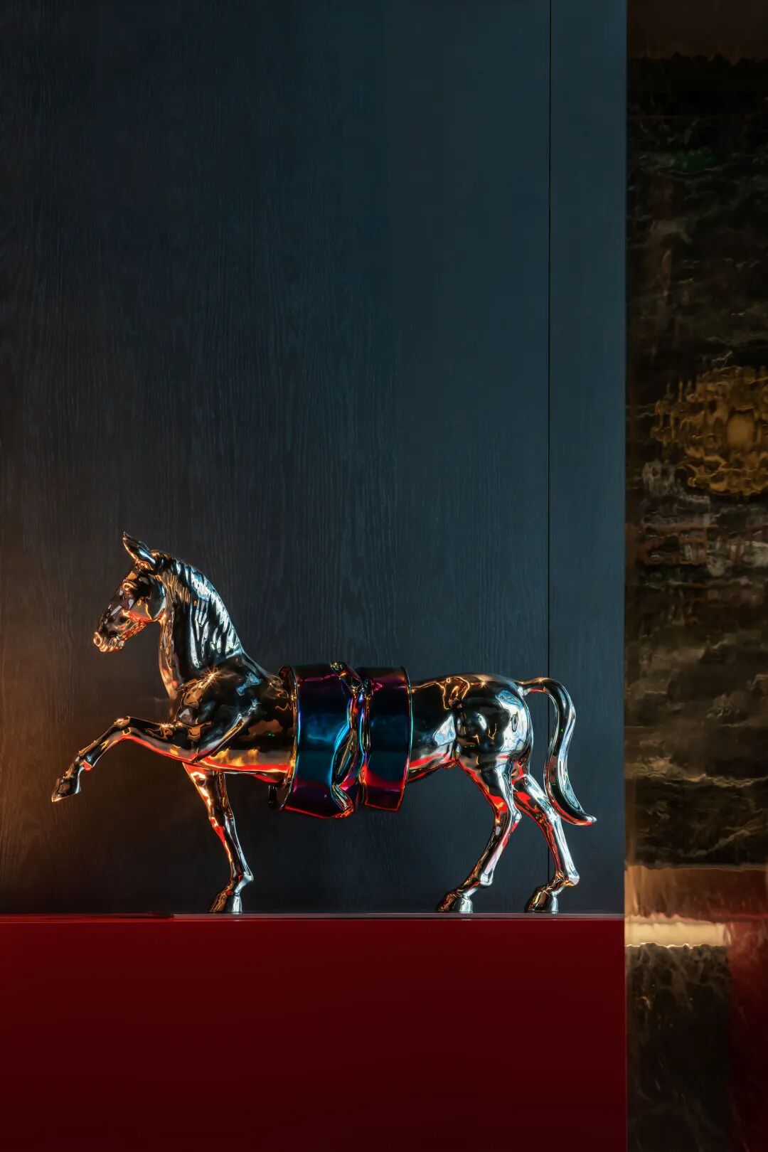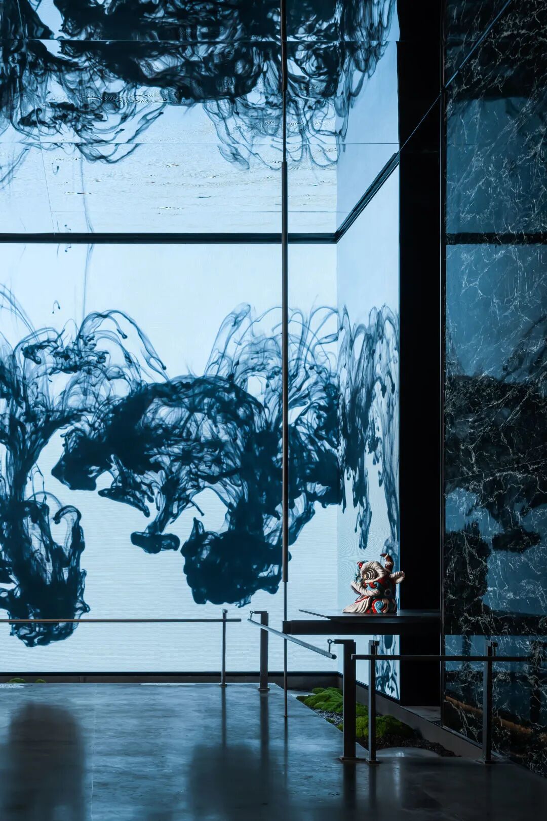 入口分别摆放的两处艺术雕塑:“源动力马”和狮子头,与多媒体的互动,呈现视觉跳跃感,一如江水奔涌,时而平缓,时而磅礴。前厅水滴形装置与窗外江水交互低语,传递一种浑然天成的默契。