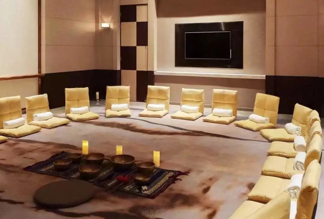 冥想一般选择晨间或者睡前,可以自己练习,也可以由老师带领。虽然熟练的练习者可以做到随时随地开始冥想,但更多的人还是需要一个安静且不被打扰的空间,同时利用颂钵、盐灯、植物摆件等辅助进入状态。初学者如果独自在房间练习,可能被走廊、隔壁房间、客房窗外的噪音等所影响,导致达不到最佳效果。
